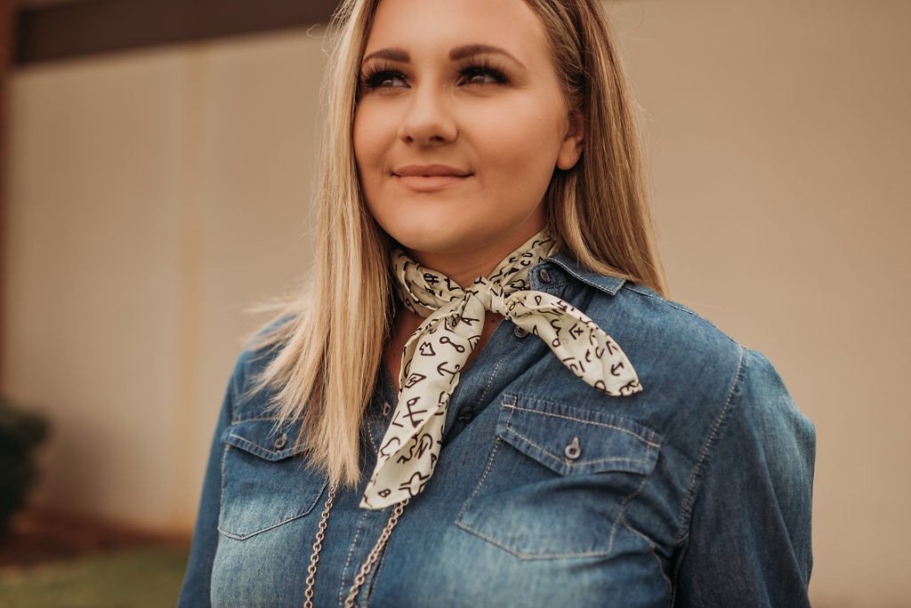 100% silk printed 20” wild rag with brand design. Available in sage, ivory and tan.