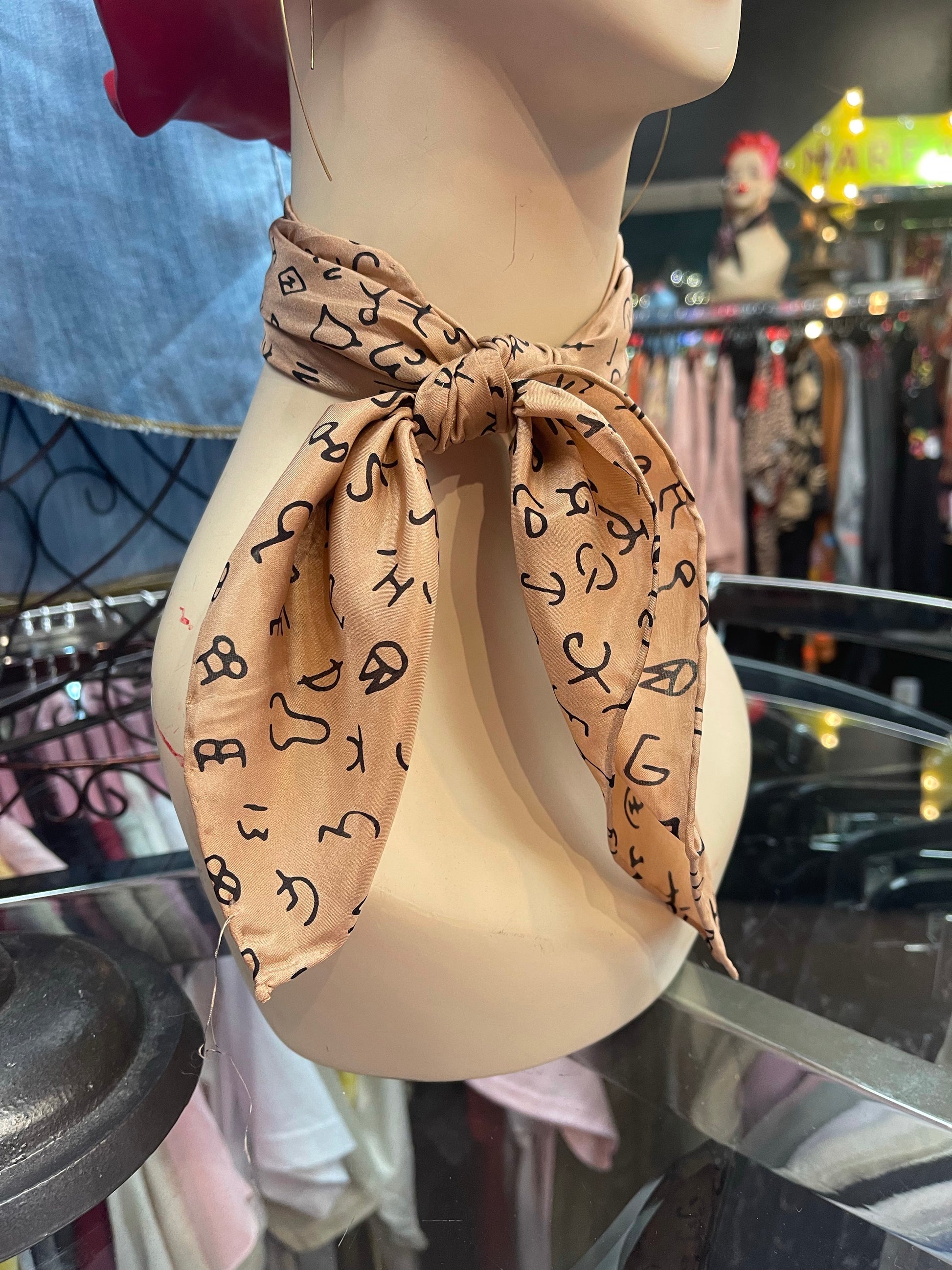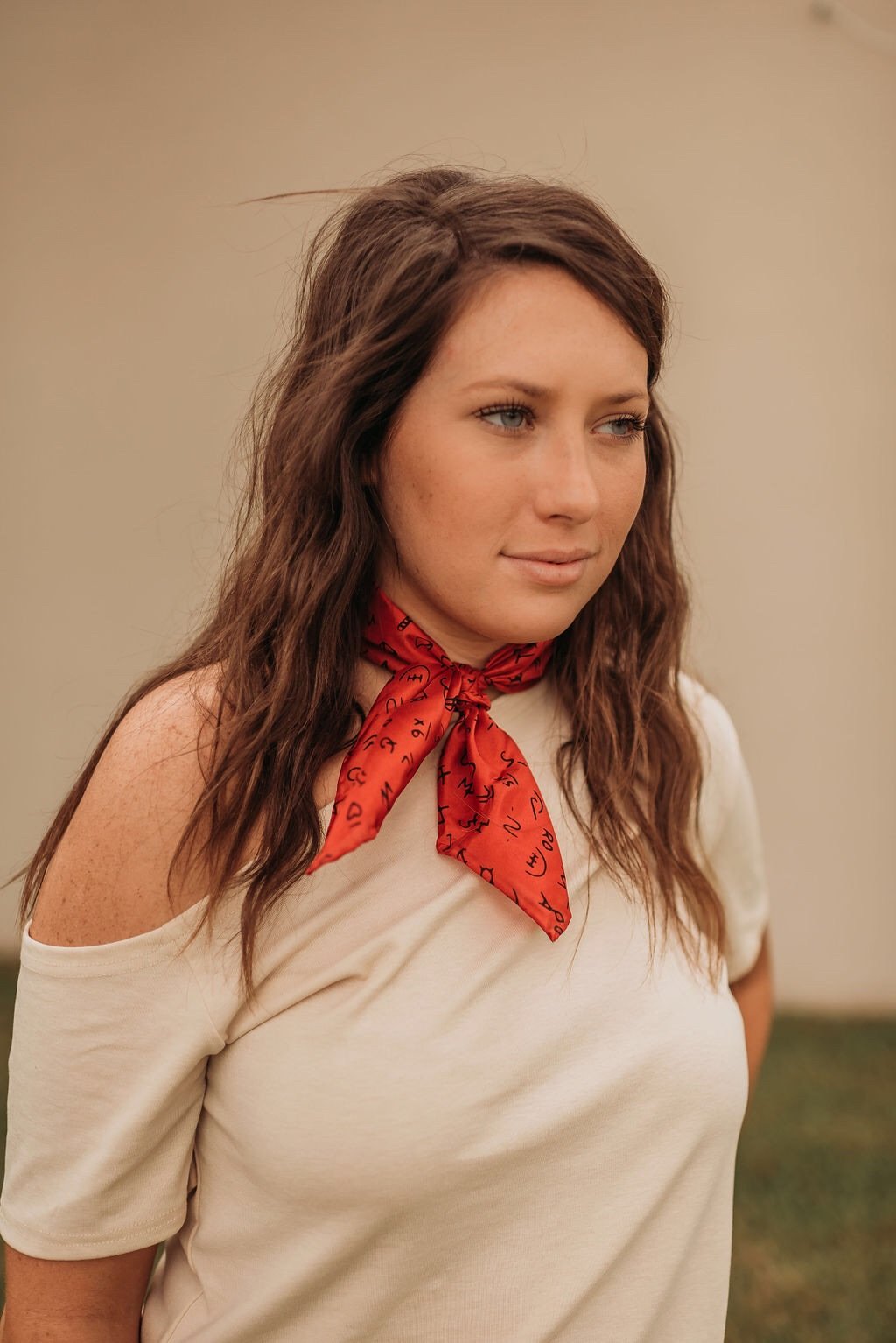 100% silk printed 20” wild rag with brand design. Available in red, royal, ivory, tan and sage.
