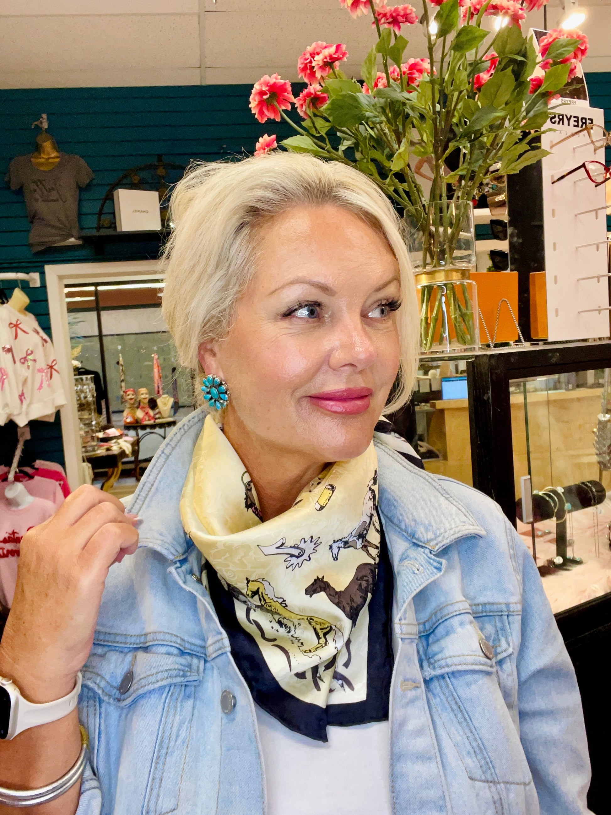 Bring fun to your look with this 34.5" Mustang print Silk Scarf by Wyoming Traders. Its silky texture feels luxurious against your skin, while the ivory or gold background colors add a fun, stylish twist. Perfectly sized for tying around your neck, wrist, or hair, it’s the versatile accessory that adds a little flair wherever you wear it.