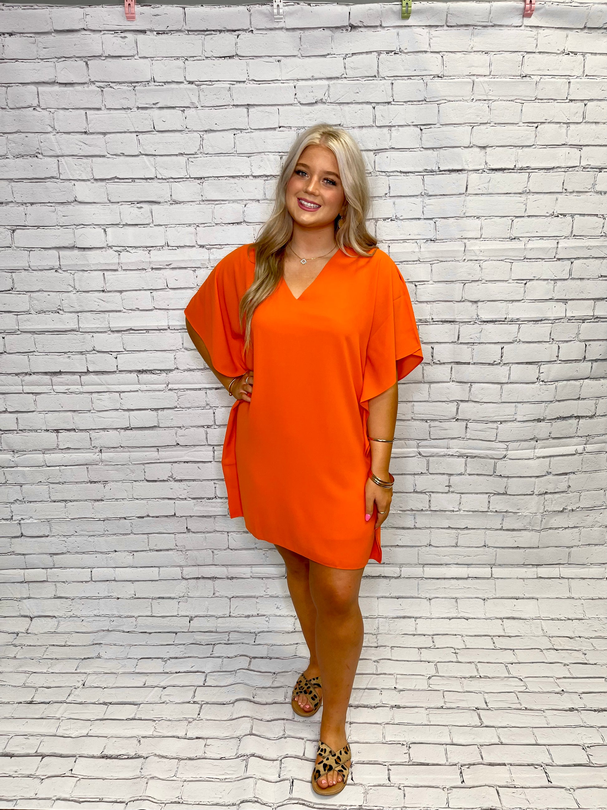 A gorgeous dress in striking color of orange. A stylish drape design that flatters the figure. With split sleeves, v neck, waterfall draping on the side of the dramatic sleeves. This stylish dress has class draped all over it.