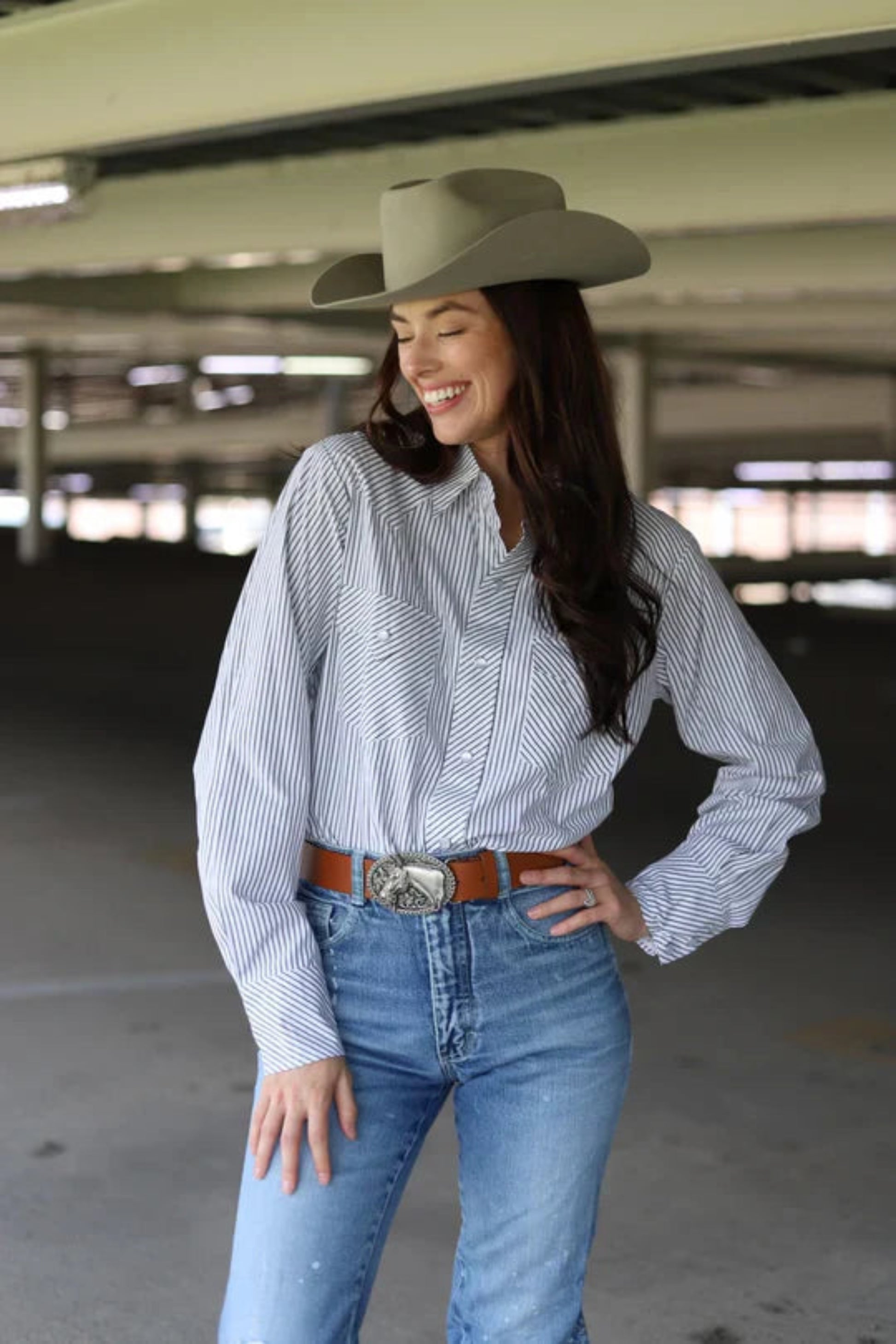 The Black Striped Vintage Pearl Snap Shirt is a feminine take on a classic western style, featuring black-and-white stripes for a modern yet timeless statement piece.