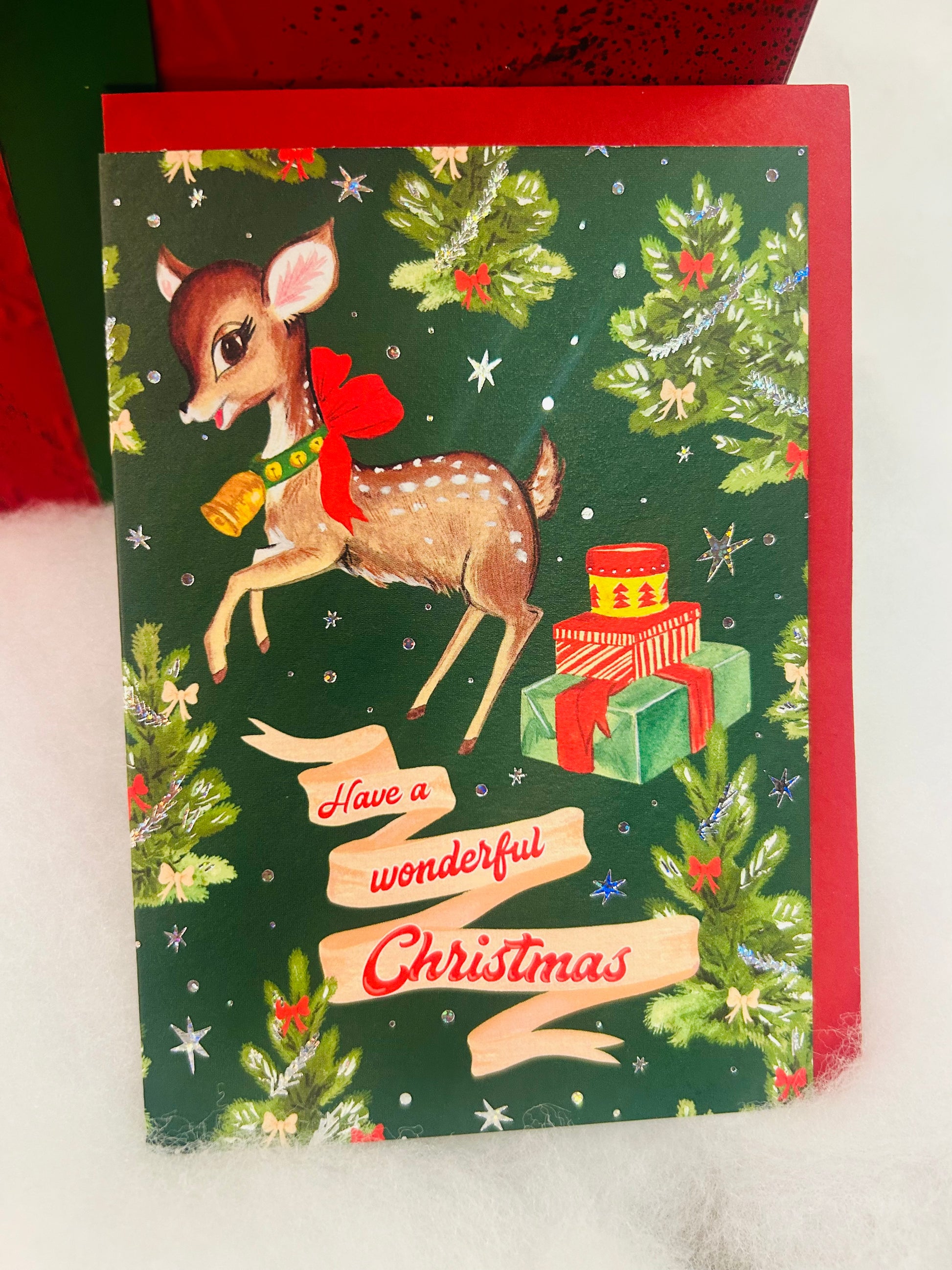 Say merry Christmas with this sparkly card. This card features smiling Santa surrounded by tinsel and reads 'Have a Wonderful Christmas!'
