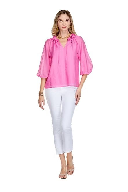 This chic pink blouse by JADE is a summer must-have, featuring playful dimensional flowers around the collar that add a stylish pop. Made from lightweight, breezy fabric, it keeps you cool and comfortable while turning heads wherever you go. Perfect for sunny days and effortless style!