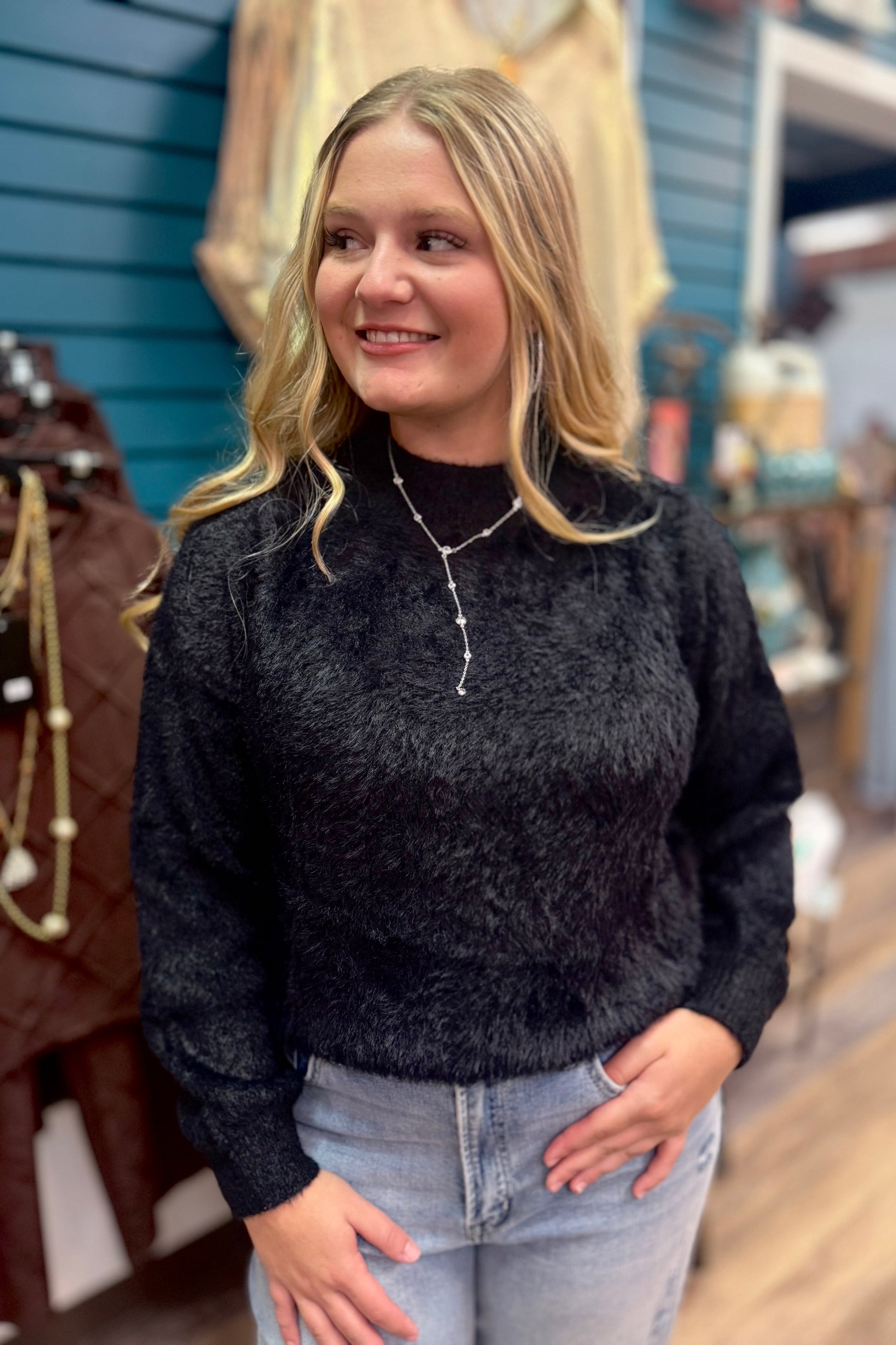 Cozy up in this fluffy sweater that feels like a warm hug—your go-to for chilly days! Featuring long sleeves, a snug neckline, and a straight, cropped fit with ribbed edges. Perfect for dressing up or keeping it casual with your favorite jeans.