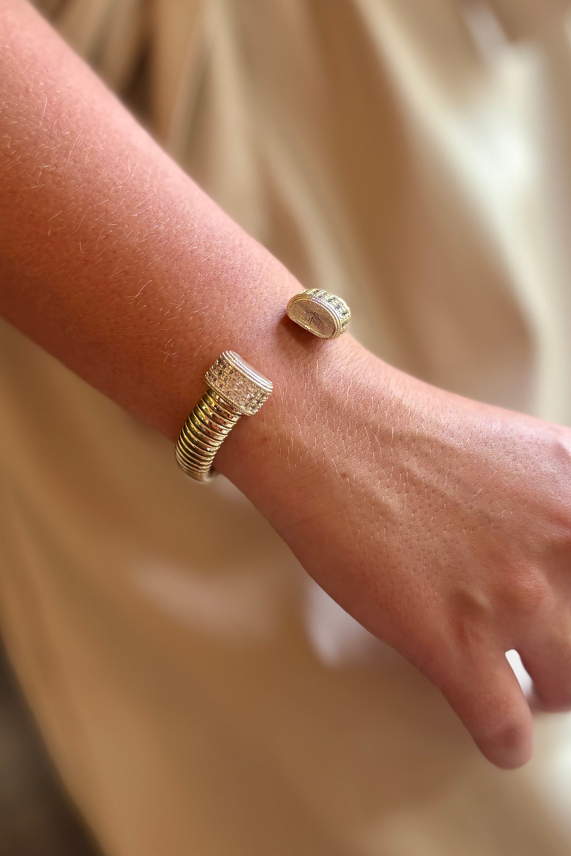 Add a touch of sparkle to your wrist with this playful gold coil bracelet, featuring dazzling CZ ends that catch the light with every move. Its flexible coil design makes it easy to wear and adjust, perfect for adding a fun, chic twist to any outfit.