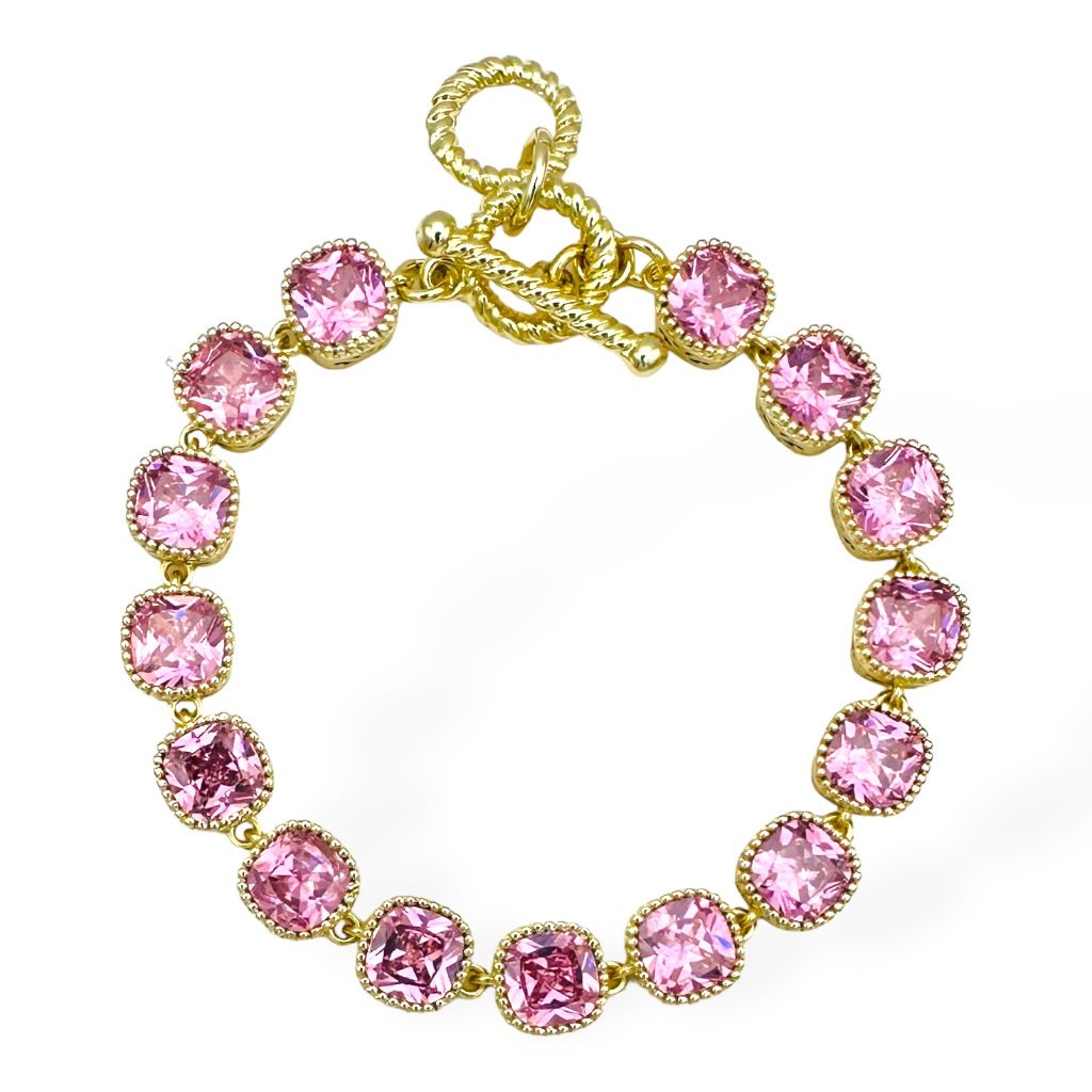 Add a splash of sparkle with this gold multi pink or clear stone bracelet! Featuring a playful mix of pink or clear stones set in gleaming gold, it’s the perfect accessory to brighten any outfit and add a fun, feminine touch to your look. Adjustable length up to 7.5".
