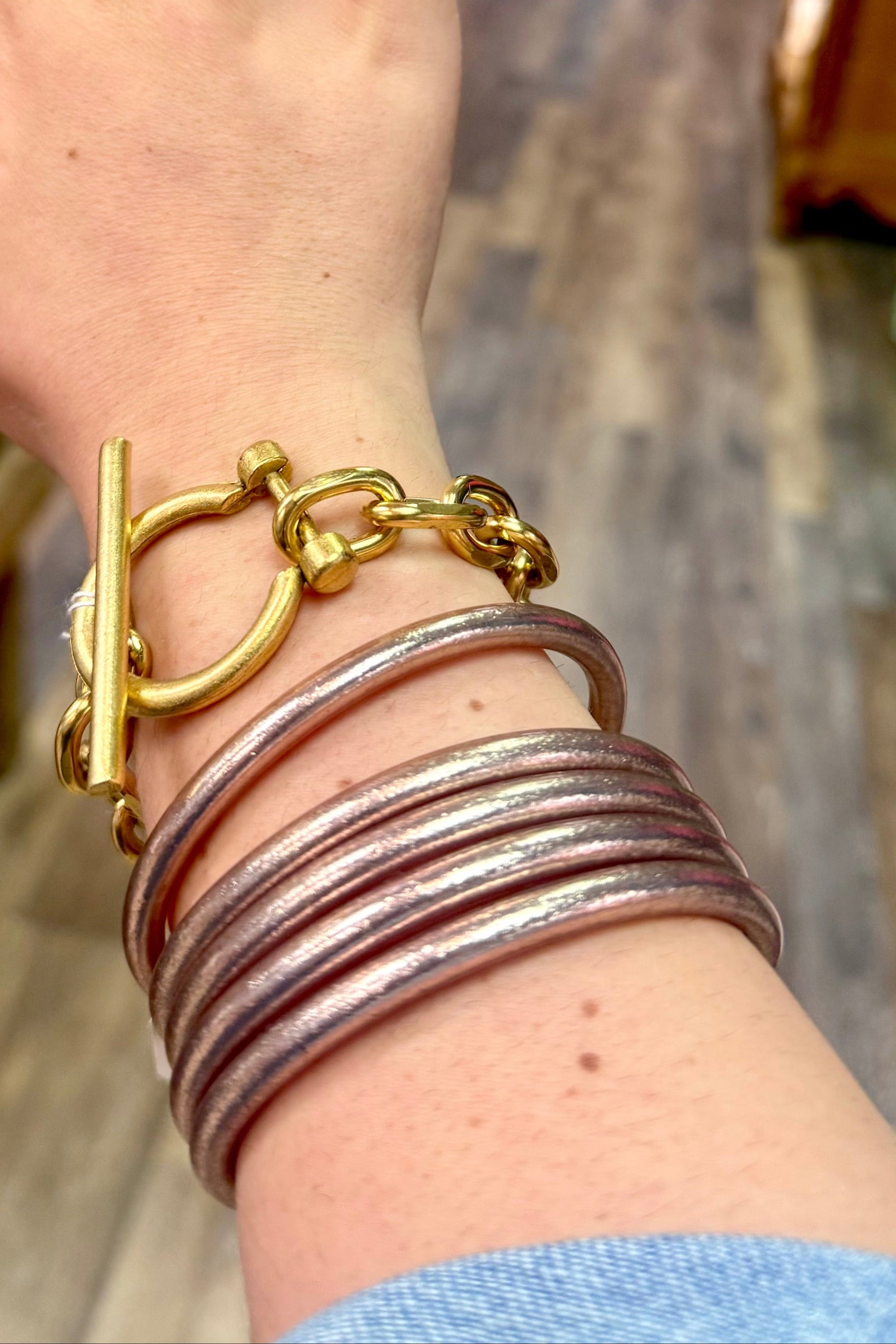 Let's keep that western theme going with a horse bit bracelet by our favorite designer Yochi New York. Length is up to 7 1/2 inches. Comes in satin silver or gold tone.