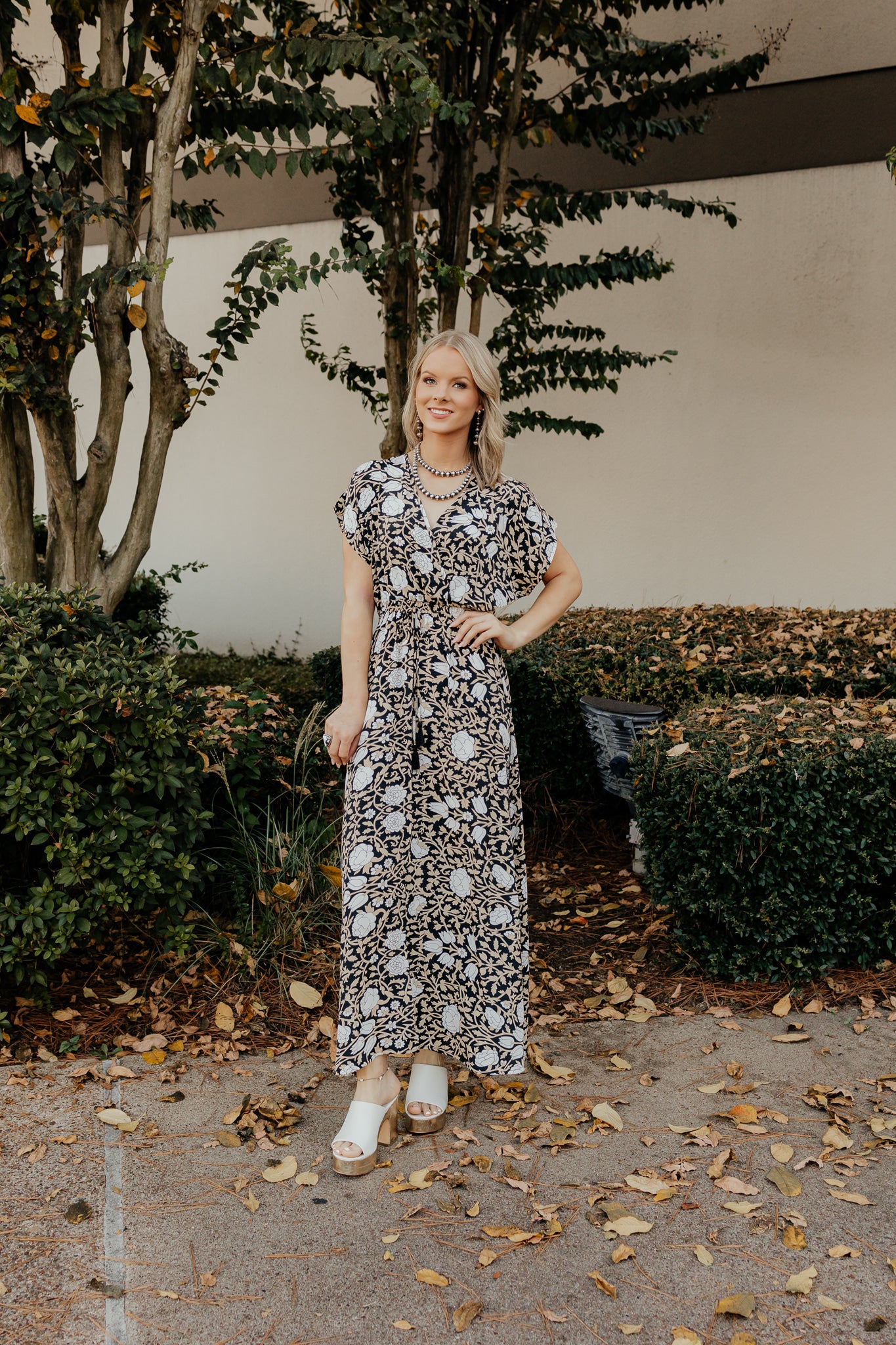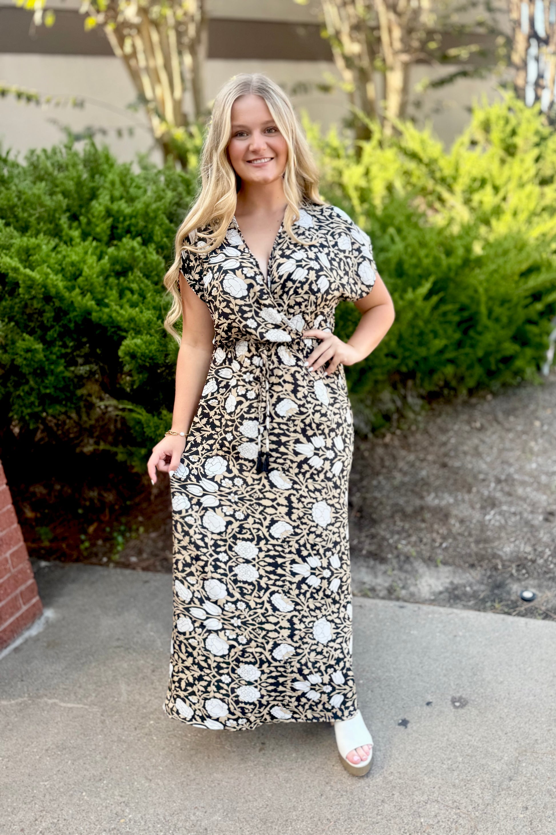 Perfect for every day, dress up or vacation, this dress features a charming V-neck and cap sleeves for a flattering look. Side vents add a breezy touch, while a subtle floral pattern in tones of black, taupe, and off white bring delicate charm. The elastic waist is dressed up with a string faux tie finished with beads and tassels. Crafted from a silk/poly blend, it offers a soft, flowing, and luxurious feel. Care is easy: hand wash separately, hang to dry, and cool iron if necessary.