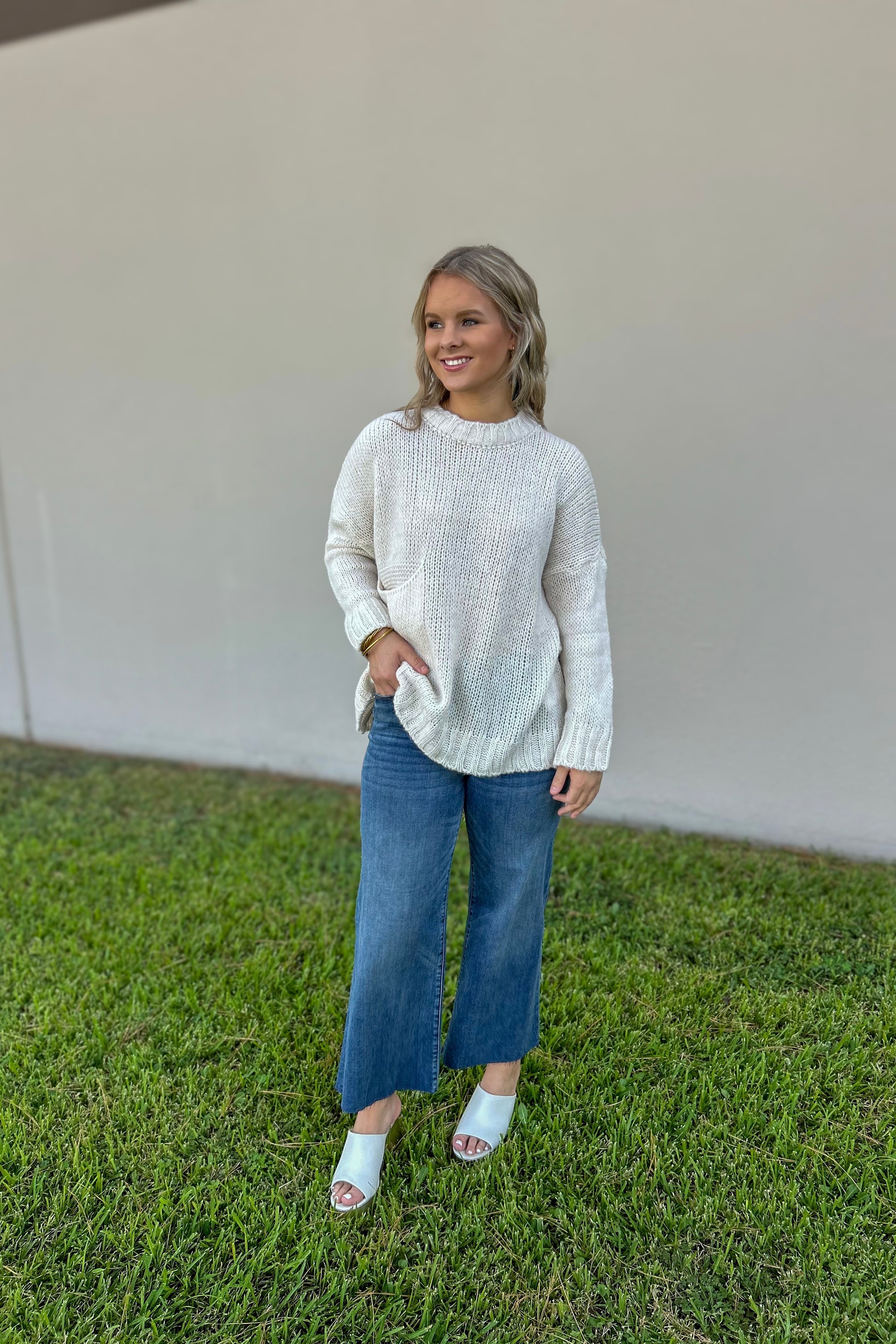 Introducing your go-to sweater for any season. With a relaxed fit, this cozy crew neck features a drop sleeve and a front pocket. Made with a blend of acrylic, viscose, and just a hint of wool, it's perfect for layering over your favorite button ups, base layers, or tanks. The rustic oatmeal yarn adds a touch of charm and pairs perfectly with skirts or pants. Delicate wash/cool iron if needed or dry clean.