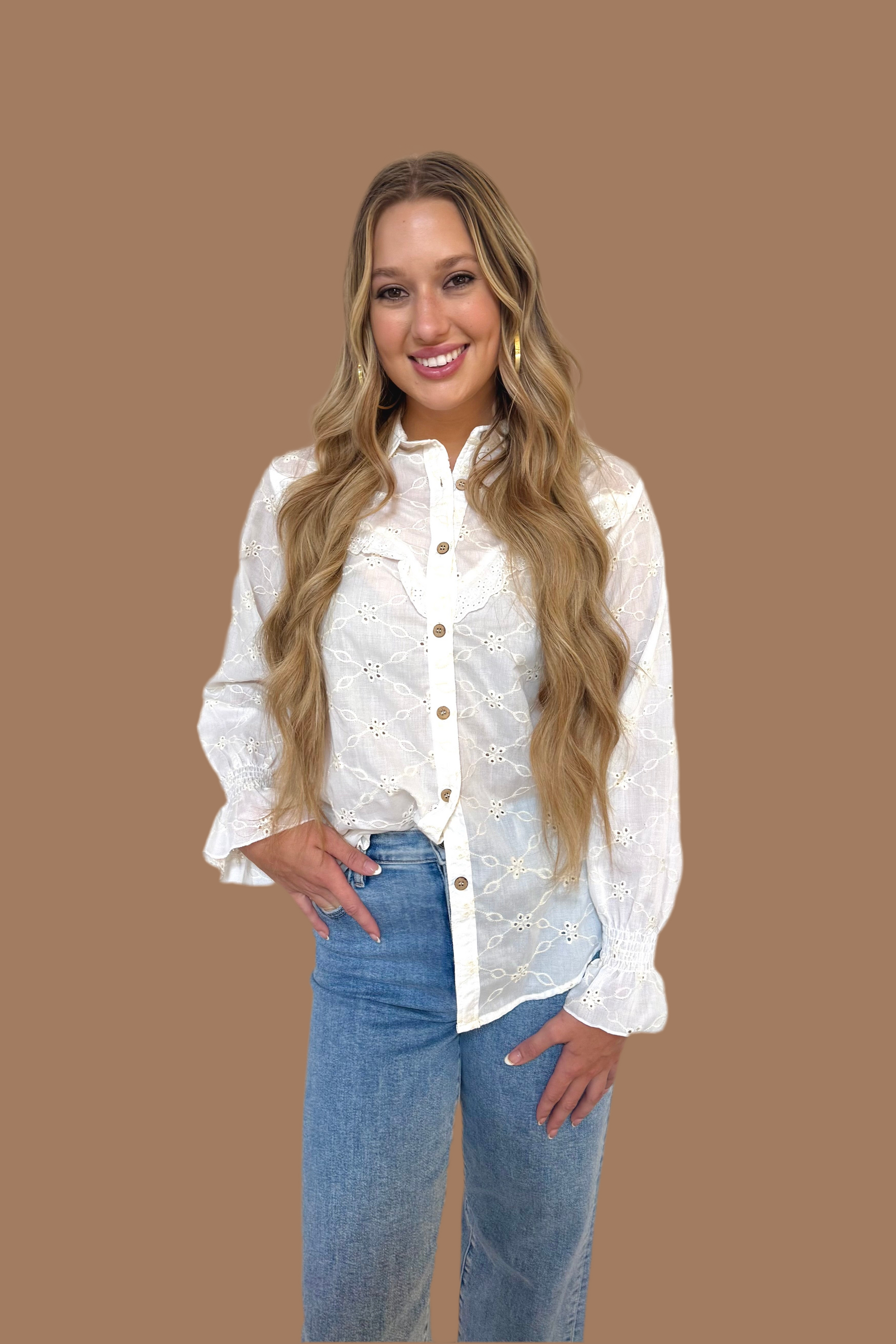 Ivory Eyelet Button-Up Blouse with Ruffle Accents by Turquoise Haven