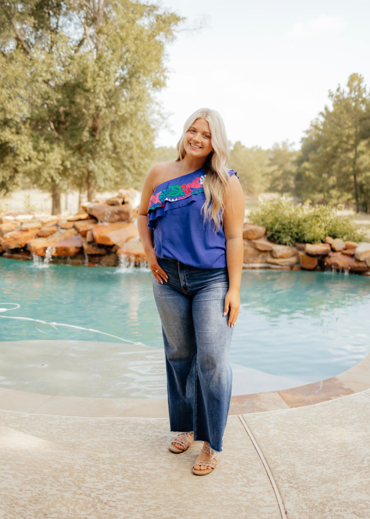 This royal blue top is for lovers of fun and flare. This one-shoulder top features super fun geometric and floral embroidery. This top is perfect for warmer, clear sky days.