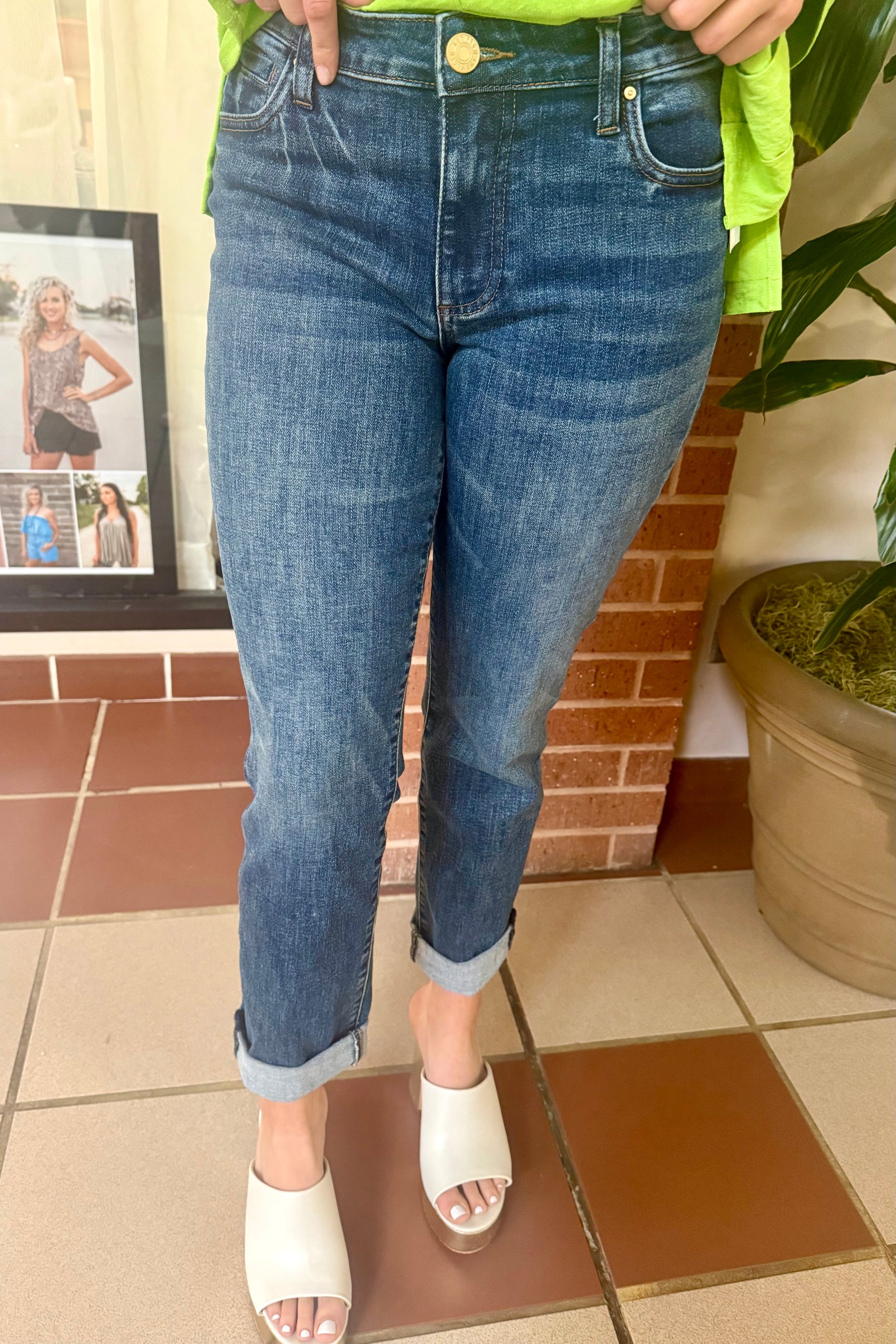 KUT's Catherine Boyfriend jeans - The Giving Wash Dark - are perfect for a casual, carefree look. With a medium dark wash, these jeans have a 27" inseam, 8" leg opening, 10 1/2" front rise, and 15" back rise (size 8). Zip fly with button closure. Made of 74% cotton, 24% polyester, and 2% spandex, they're both comfortable and stylish. Just throw them in the wash and tumble dry for an easy clean!