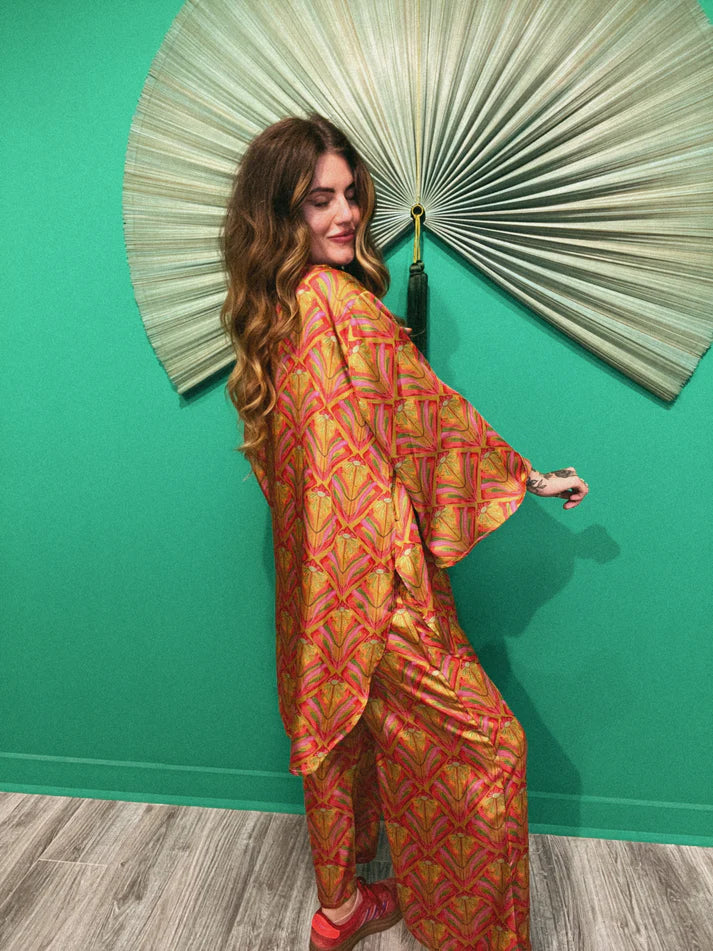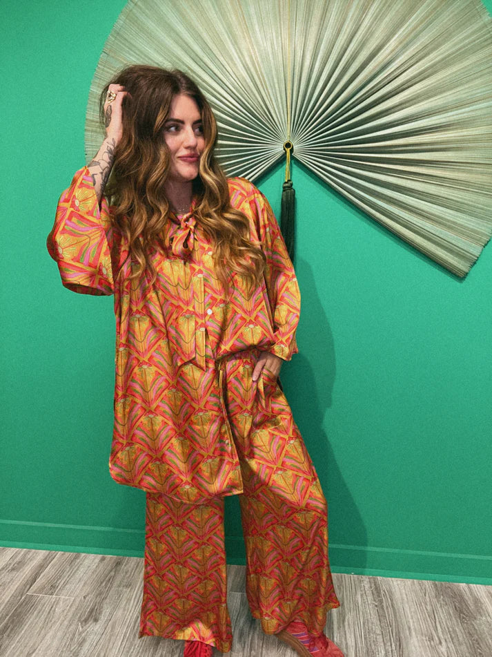 Introducing the Lady LeFleur Set—where comfort meets style with a dash of flair. This two-piece ensemble features a breezy satin top with a charming tie-neck detail and cheeky side slits, paired with relaxed-fit pants featuring a drawstring waist for the perfect cinch. Effortlessly cool and undeniably fun, this set is your go-to for looking put-together without trying too hard.
