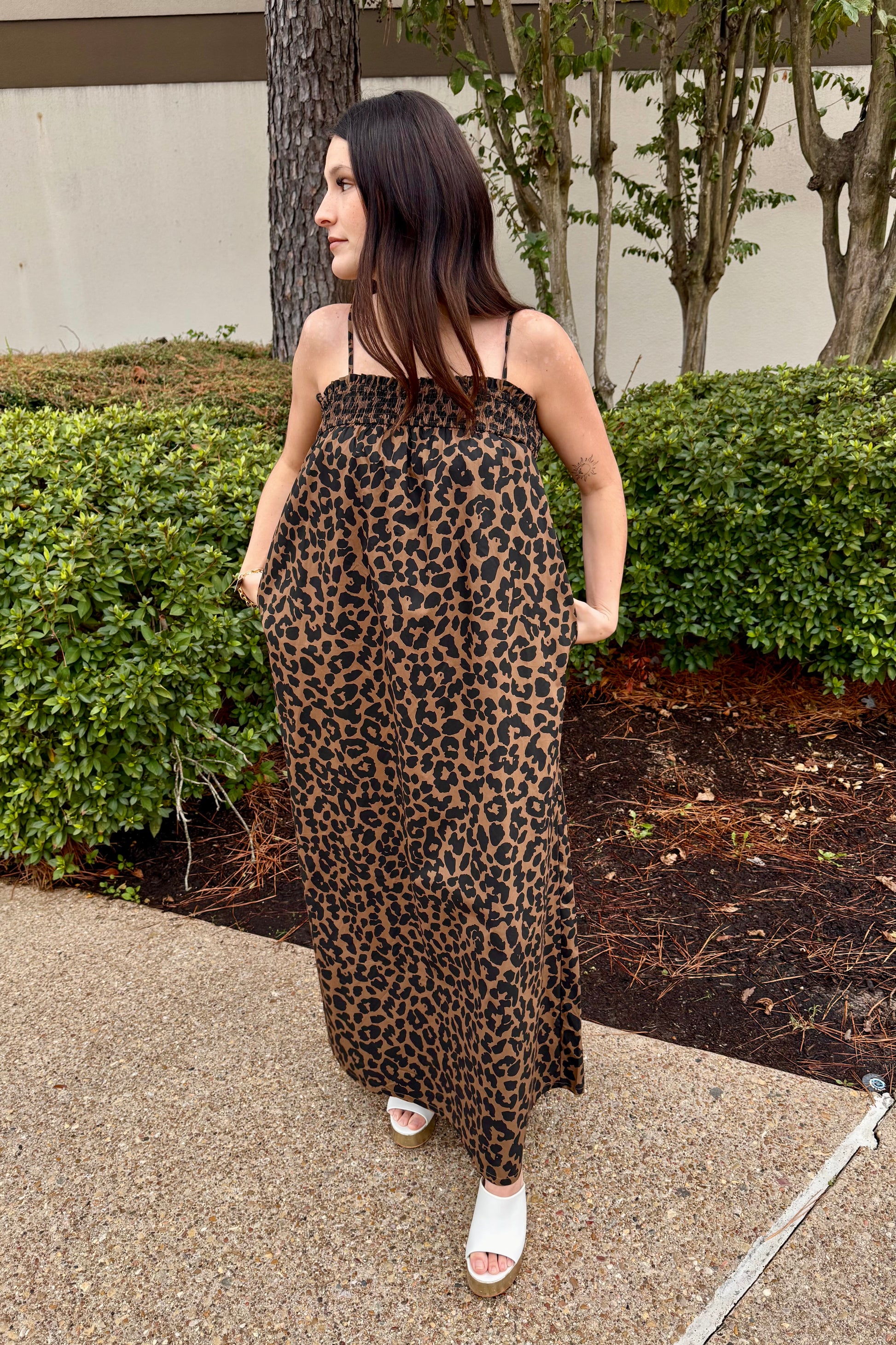 Roar into style with this Leopard Maxi Dress! Equipped with adjustable spaghetti straps, side pockets, and a shirred elastic top edge with a small ruffle, this dress is both functional and fierce. Made from 100% cotton, it's easy to care for - just hand wash cold, line dry, and cool iron if needed. Go ahead, add some wildness to your wardrobe!