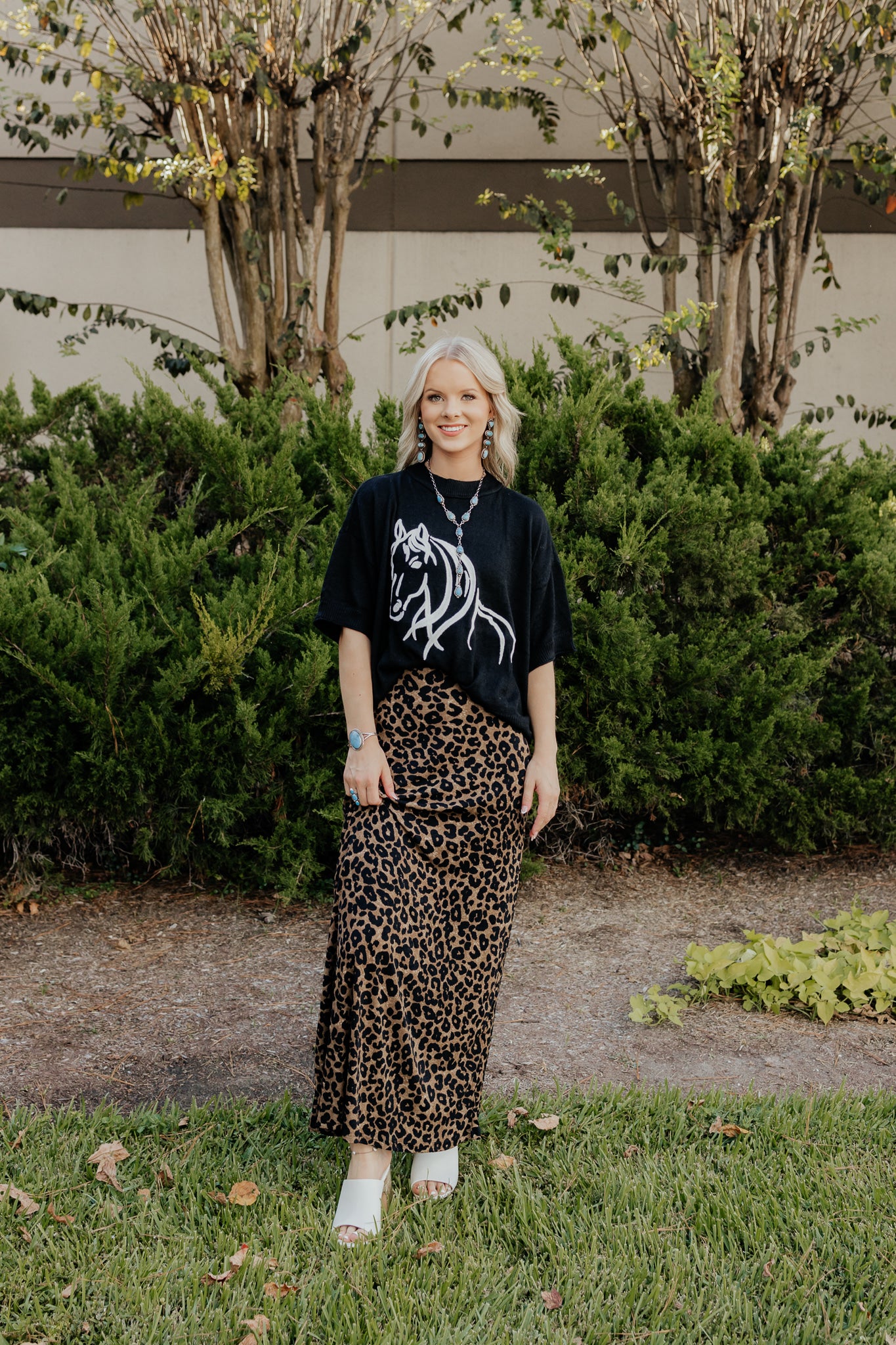 This long, flowing skirt features a bold leopard print and a high waist design. It slips on easily with a hidden elastic waistband, offering a straight fit that drapes gracefully. For size S, the side length measures 100cm, making it a fun and flattering addition to your wardrobe.