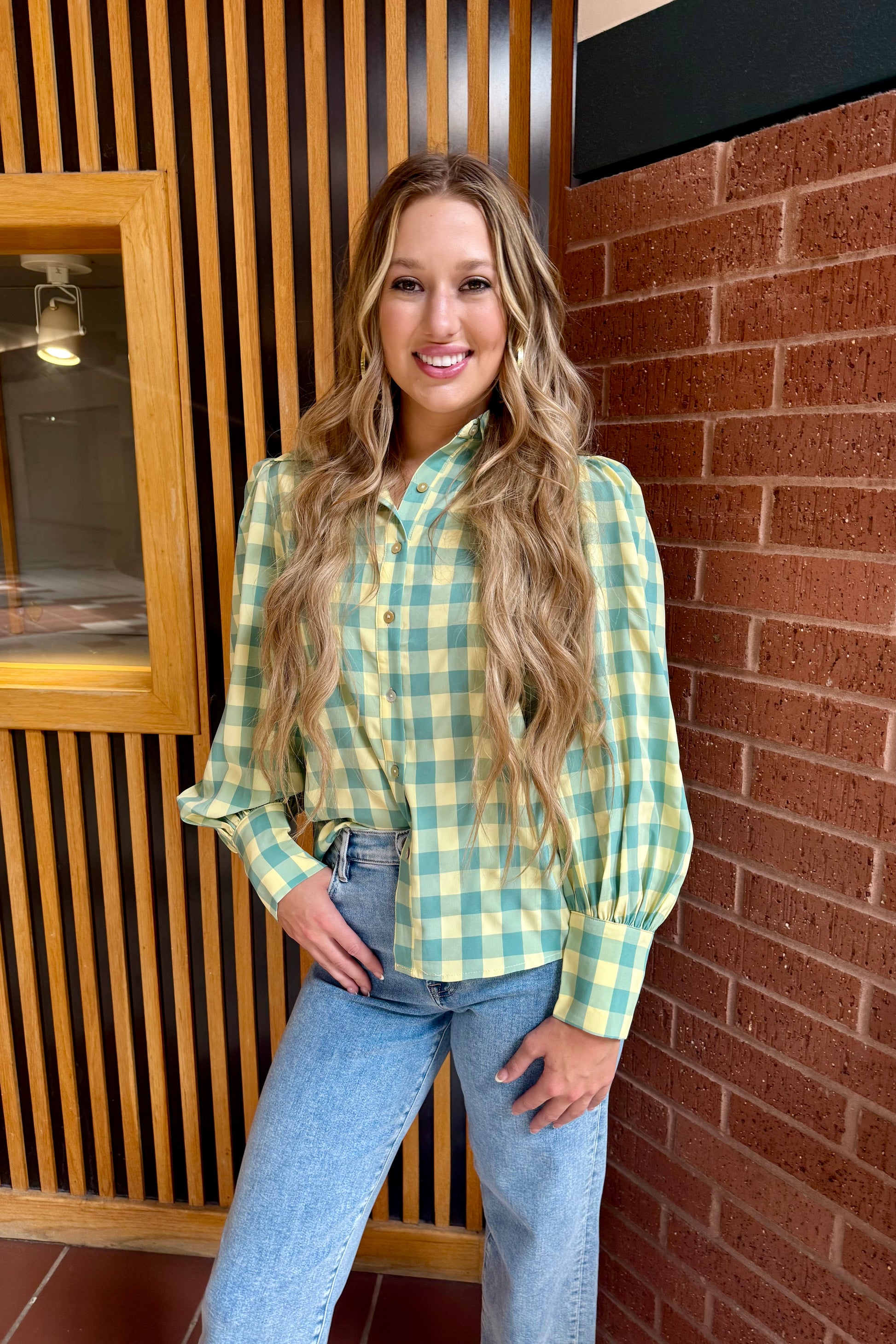 Lime Yellow Gingham Blouse -Turquoise Haven