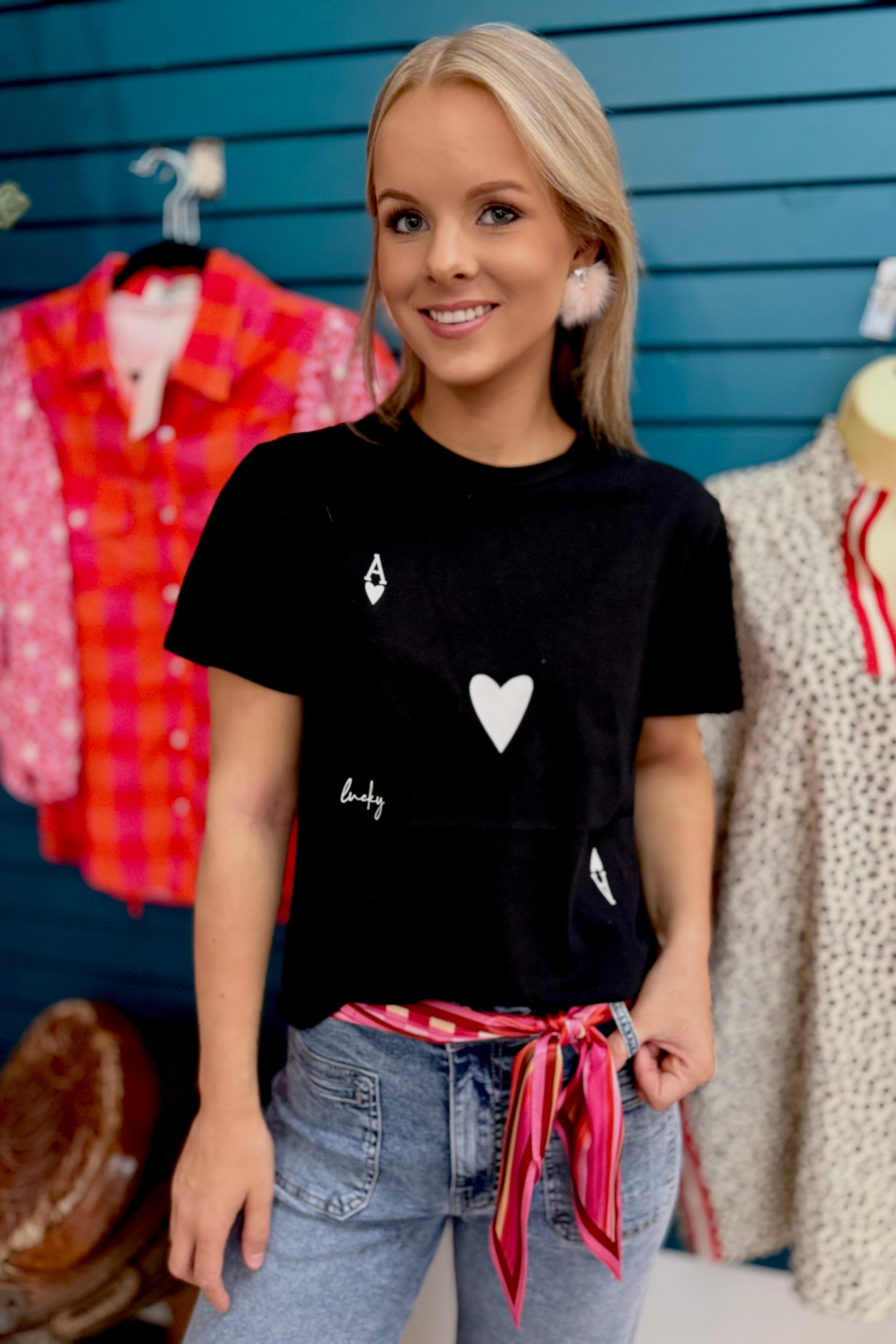 Take a chance on our stylish black short sleeve tee featuring the iconic Ace of Hearts card design on the front. The body of the shirt is slightly boxy and has a "just to the waist" length and slightly shorter sleeve. Crafted from 100% cotton, this shirt is easy to care for—just handwash with cold water and hang to dry. If you want, give it a quick cool iron to keep it looking sharp.