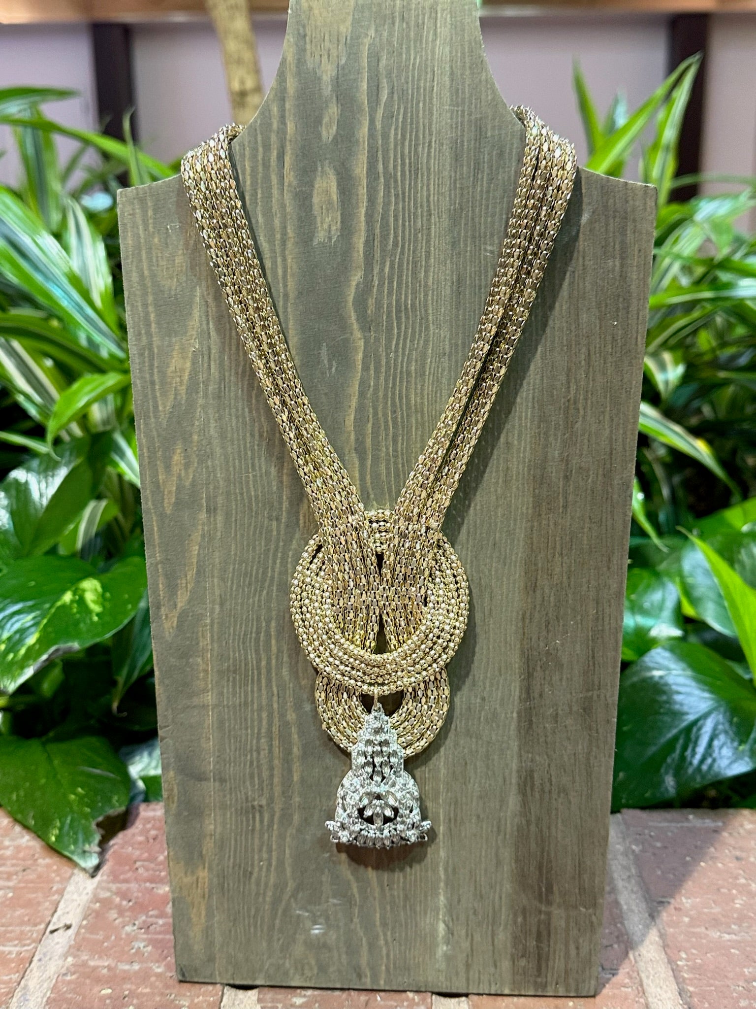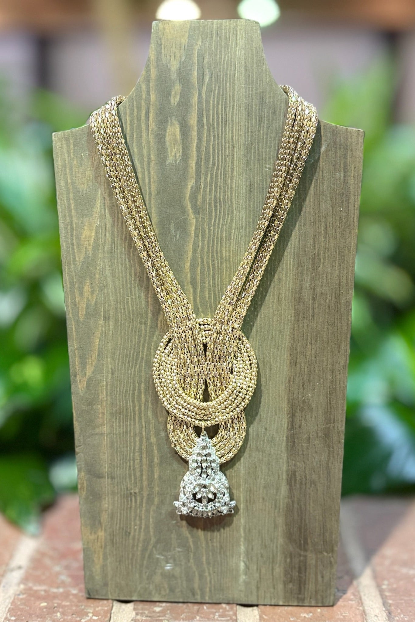 Talk about 70's inspired with a twist of pieces. Take two fabulous estate sale pieces and together they are in a whole new century. Still a throwback but the brooch adds another level to the unique necklace.