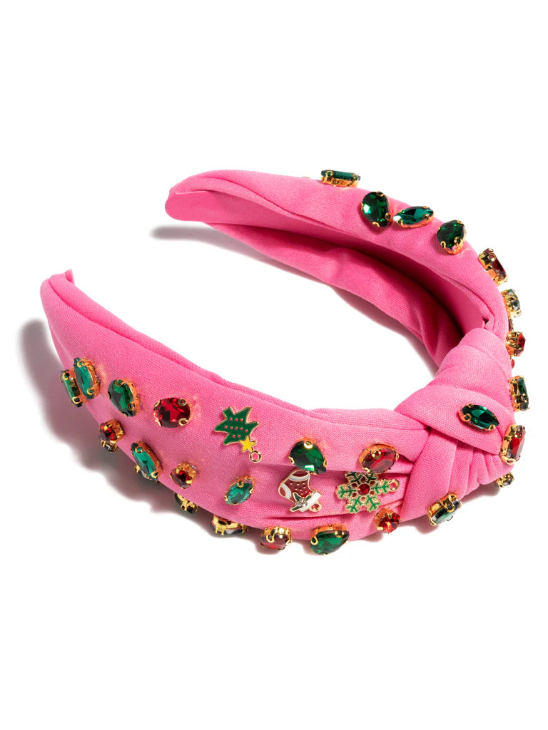 Spice up your holiday style with Shiraleah’s Merry Headband. This chic knotted headband is made of a festive pink fabric with a pattern of embroidered red and green jewels and season appropriate charms! Perfect for the holiday season, it also makes for a perfect everyday hair accessory. Pair with other items from Shiraleah’s Merry Everything collection to complete your look!