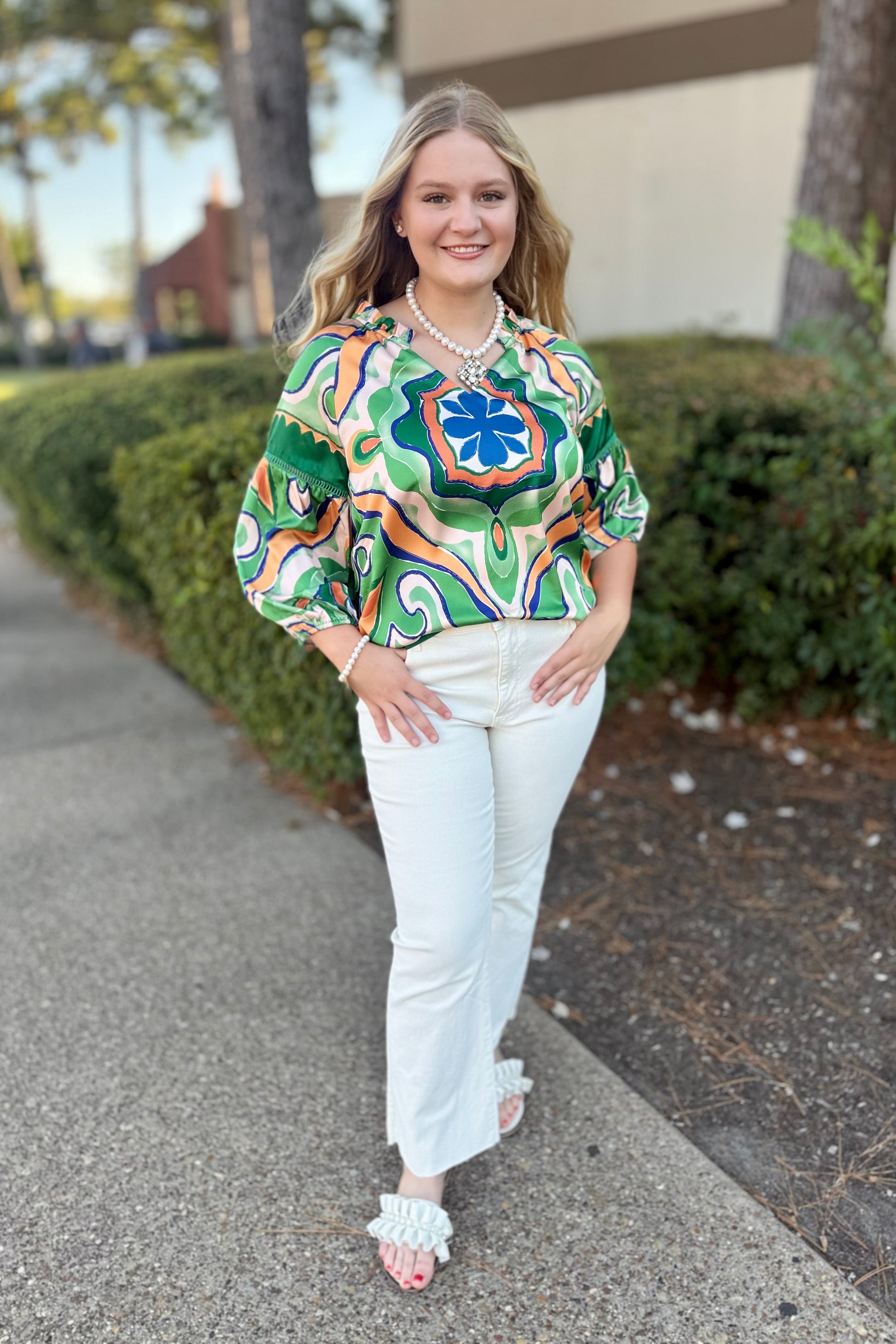 Show off vibrant Moroccan tile patterns in lively greens, navy, and orange with this flowing top that feels like your coziest scarf. It features a split neck with a sweet little ruffle and dropped shoulders leading to long sleeves gathered at the wrist with elastic. A peek of open fretwork trim decorates the mid-sleeve, while the body boasts subtle lines and a straight hem framed by a colorful border print. Made from 100% polyester, it’s easy to care for with a gentle hand wash and a flat dry.