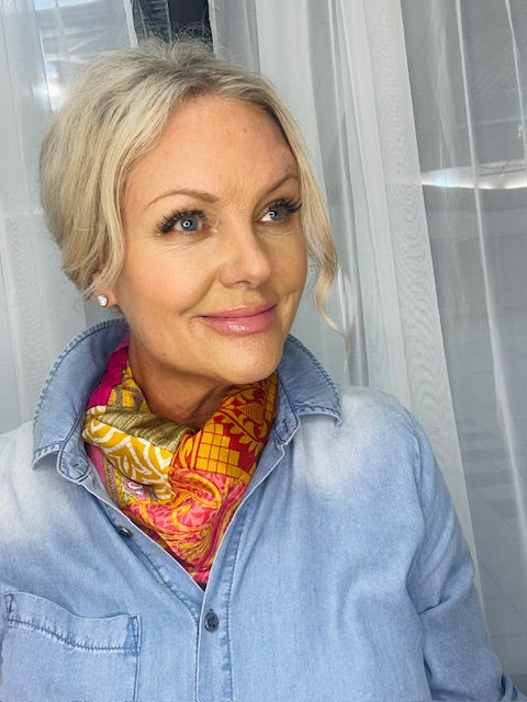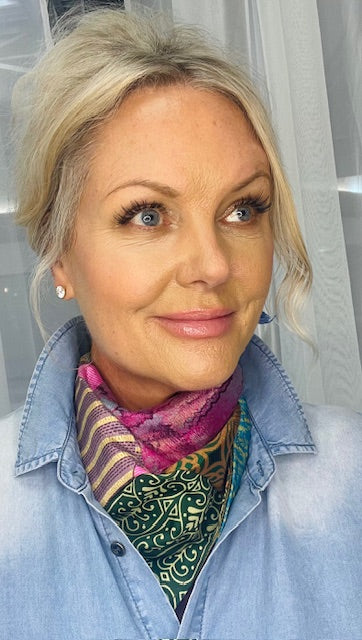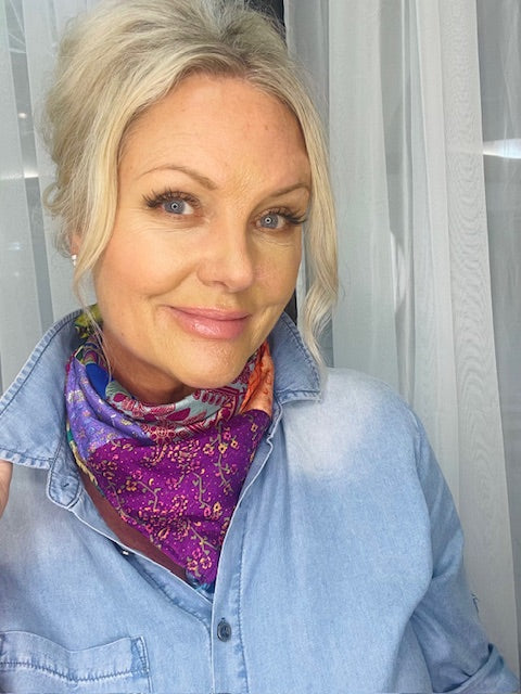 This 20" square Patchwork Silk Scarf is your new go-to for adding a playful pop of color to any outfit. Crafted from smooth silk, its vibrant patchwork design lets you mix and match styles with a fun, carefree vibe. Tie it around your neck, wrist, or bag and watch your look come alive! Each scarf is unique and varies in pattern and color and each is reversible.
