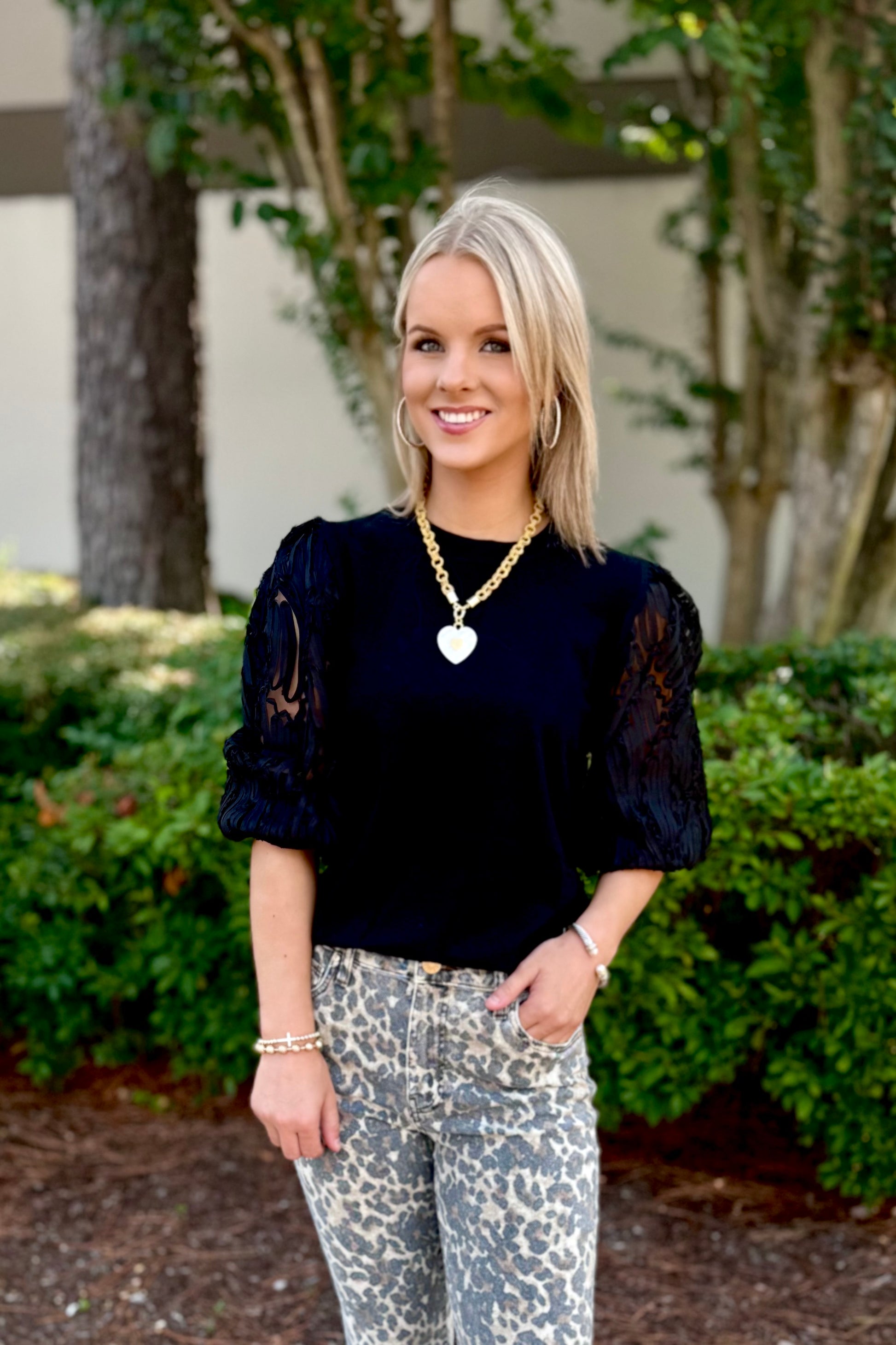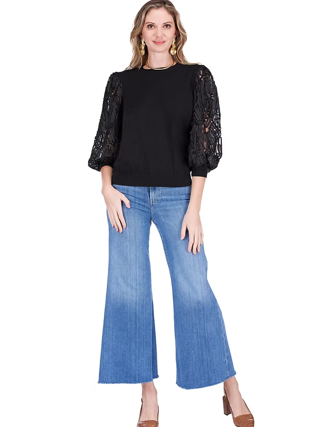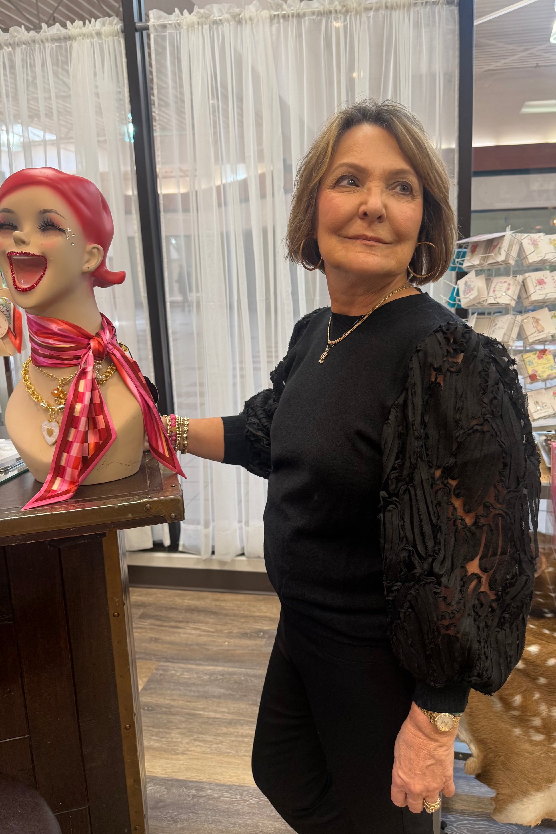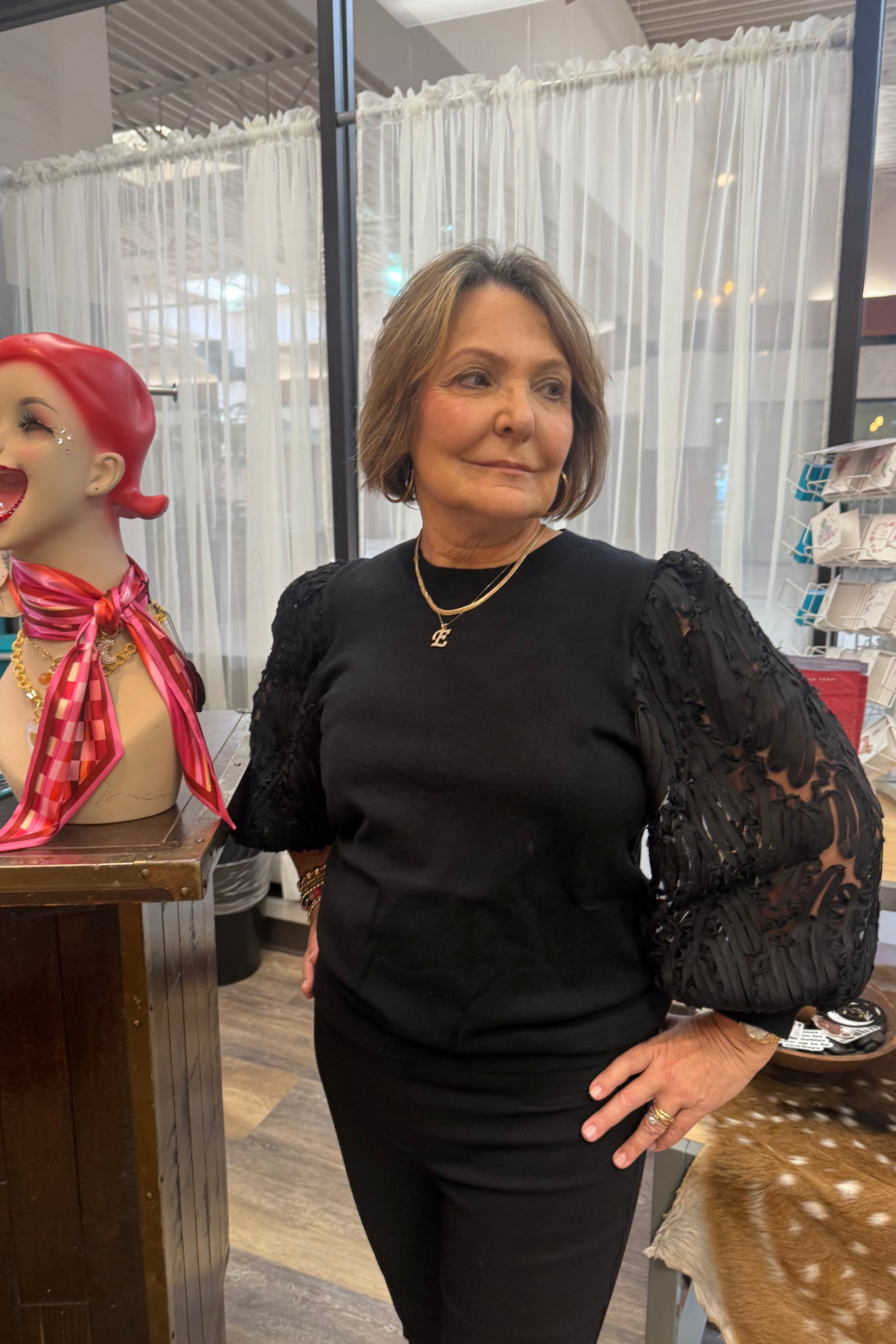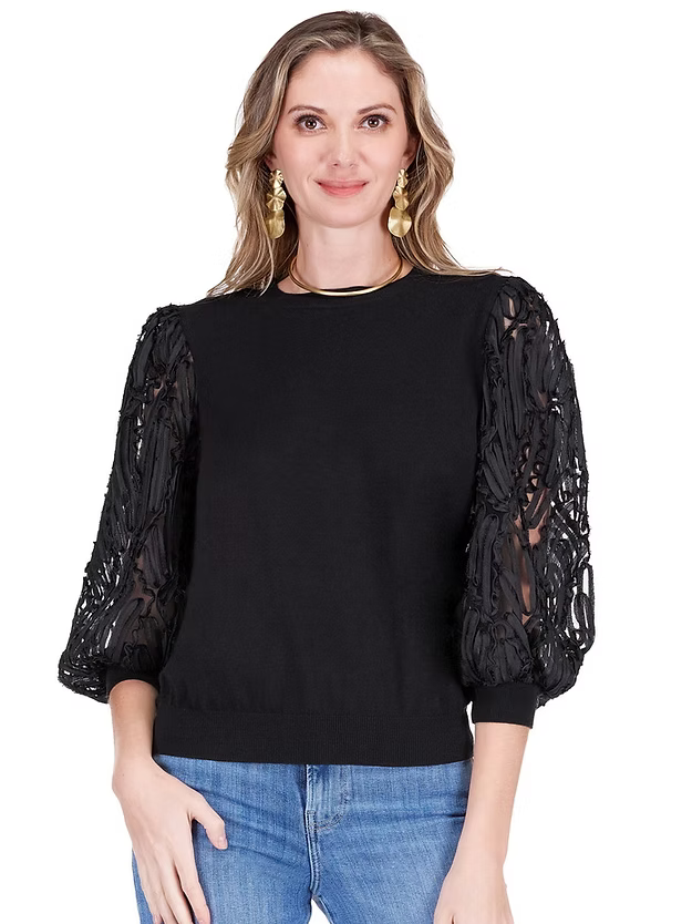 This stunning black lightsweat sweater features charming balloon sleeves with intricate details. Perfectly stylish for fall and holiday gatherings. Made from 100% acrylic. Dry clean only.