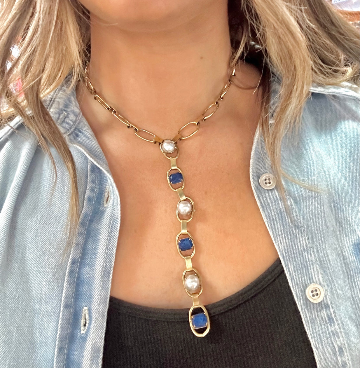 NYC-made, this unique piece rocks pearls and a blue stone for a splash of color! With a drop design and timeless lobster claw clasp, it's one-of-a-kind!