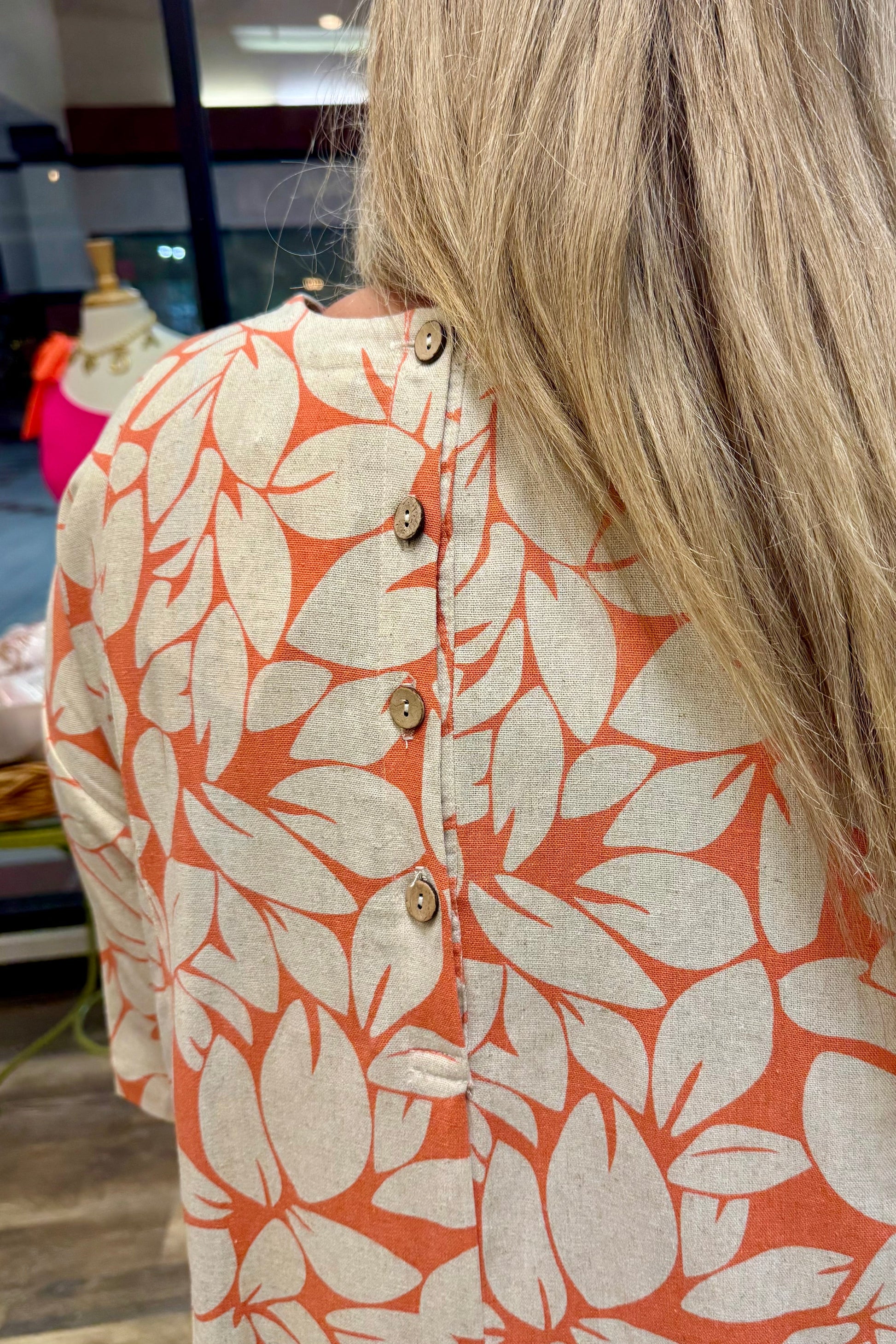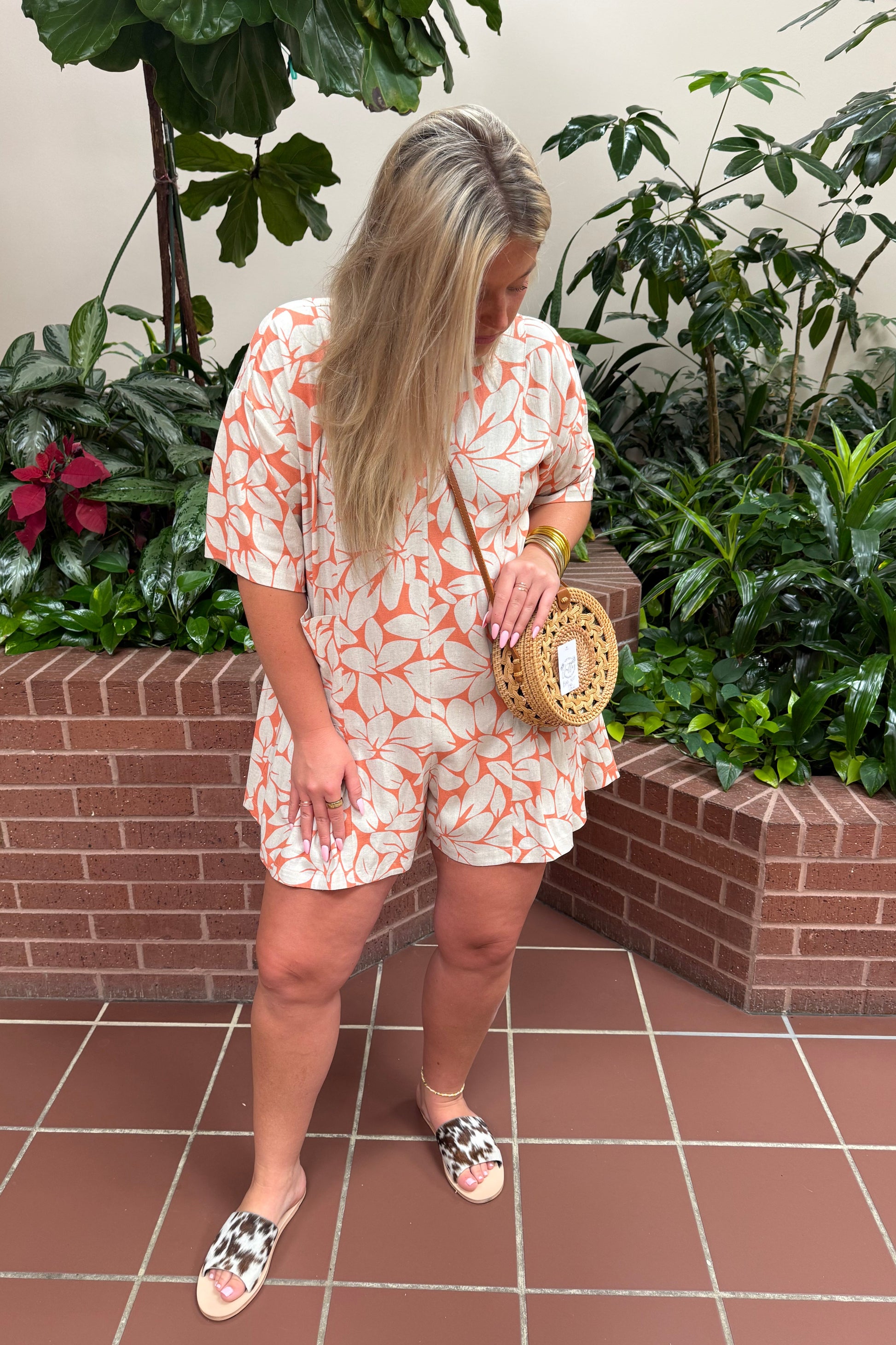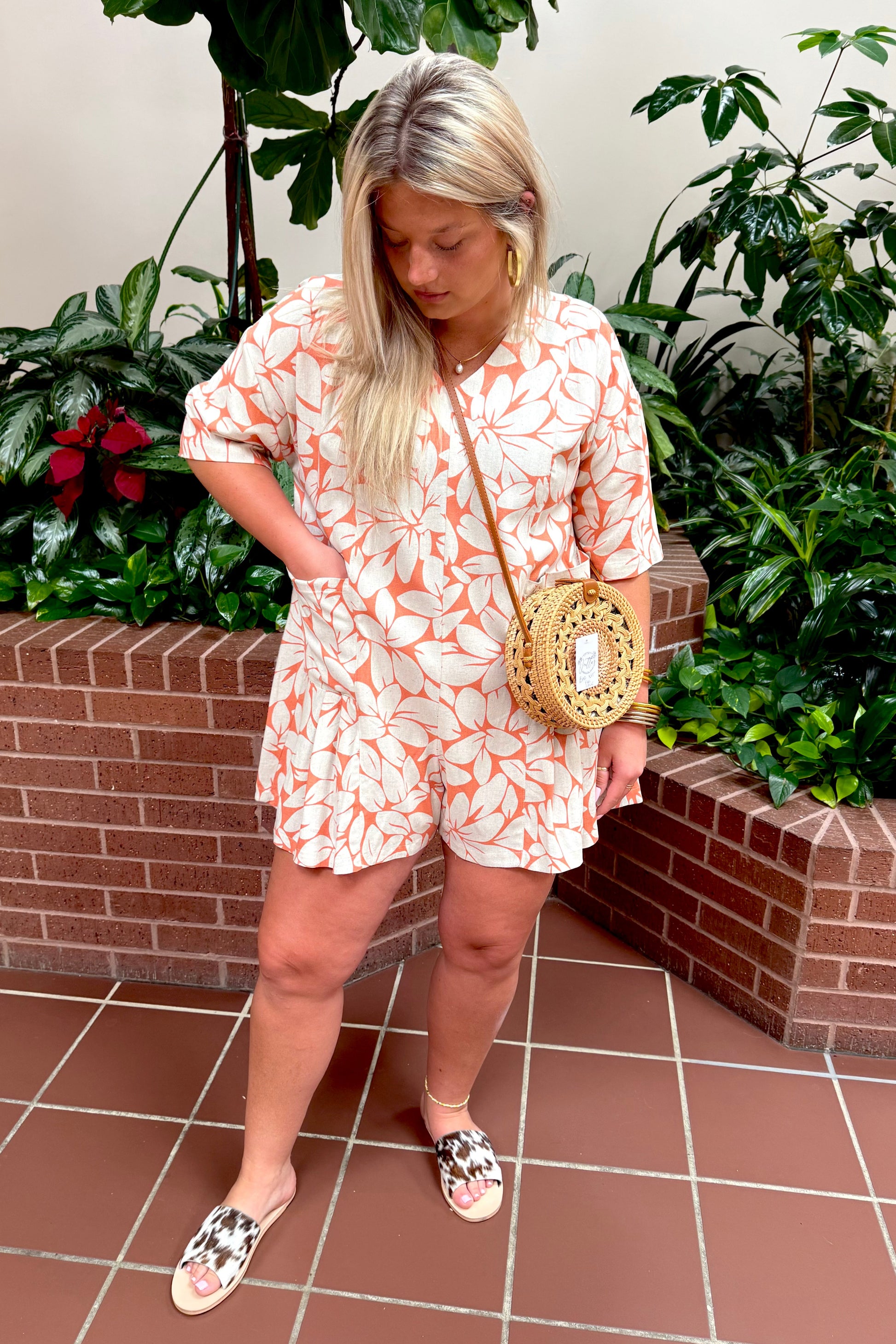 Our Pleated Hem Romper in a vibrant summer coral hue boasts a V-neck and two front slouch pockets for a playful and chic look. Made from a lightweight blend of 70% rayon and 30% linen, it's perfect for all your warm weather adventures.