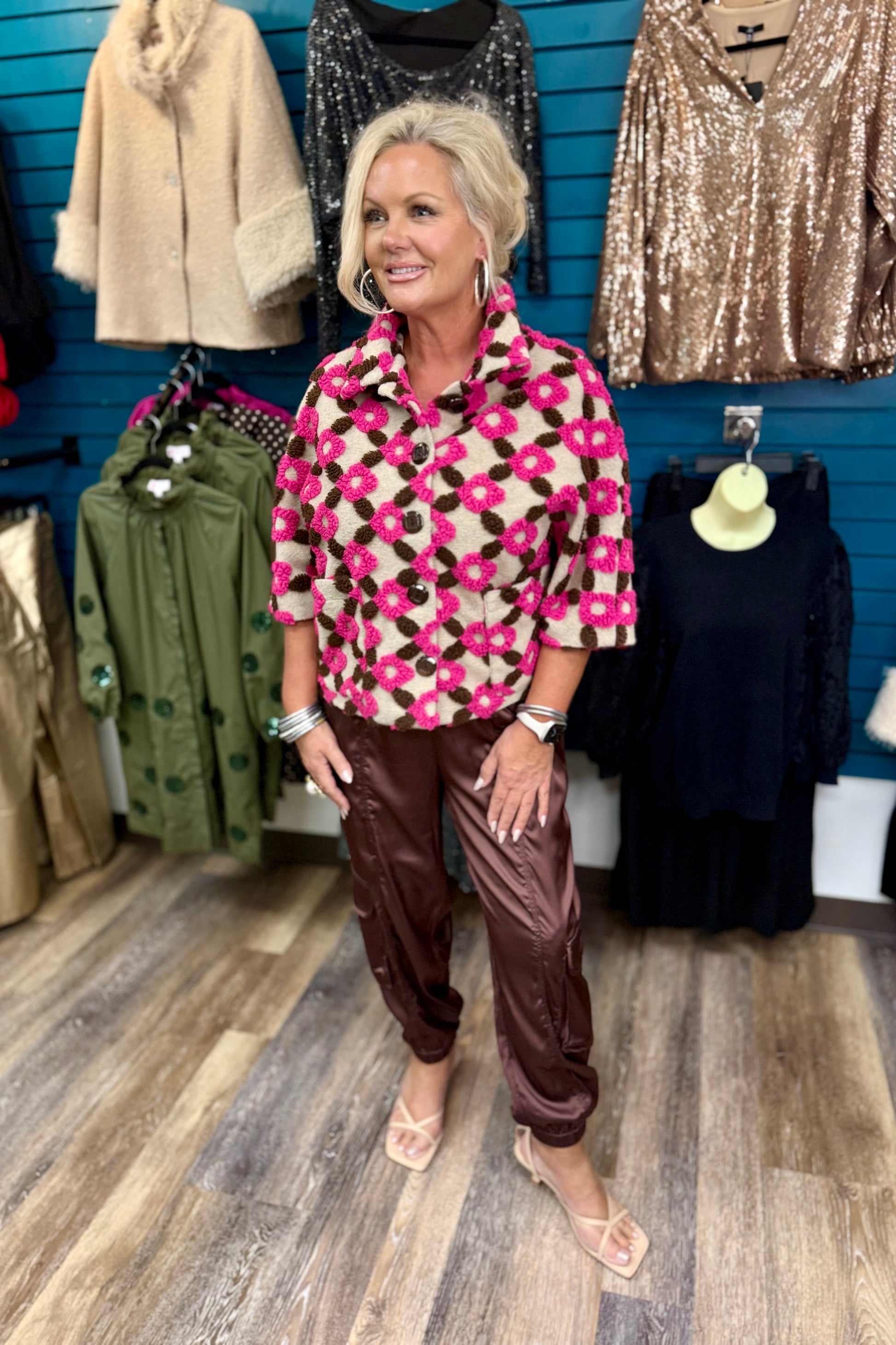 Rock a burst of botanical charm with this delightful Pop Flower Jacket. Featuring short sleeves for easy layering, practical front pockets to stash your essentials, and eye-catching brown tortoise buttons that add a touch of vintage flair. Perfect for adding personality to any outfit.