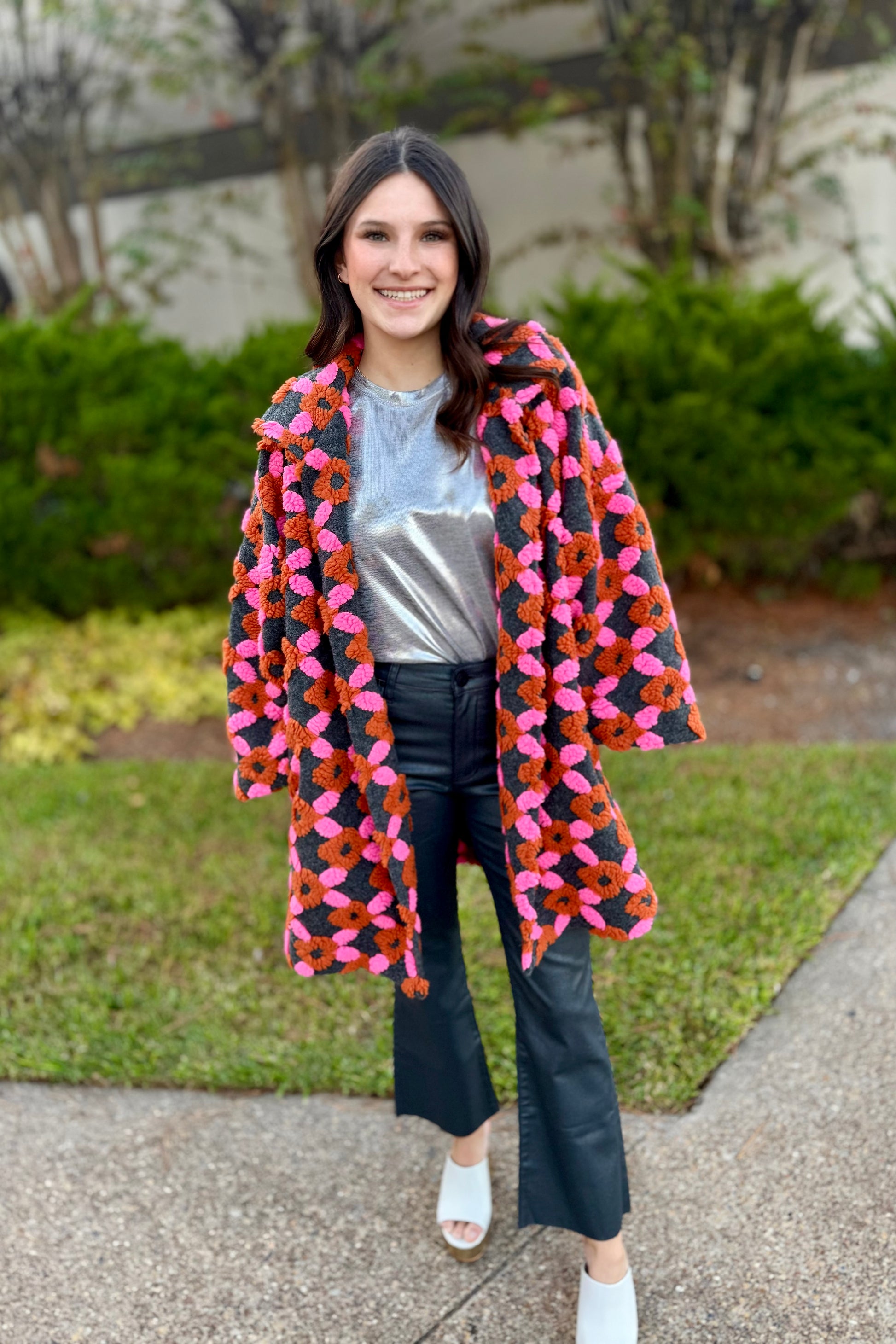 Stand out on your chilly outings with this unique Ivy Jane jacket featuring a playful puff pattern in pink and rust chenille set against a charcoal backdrop.