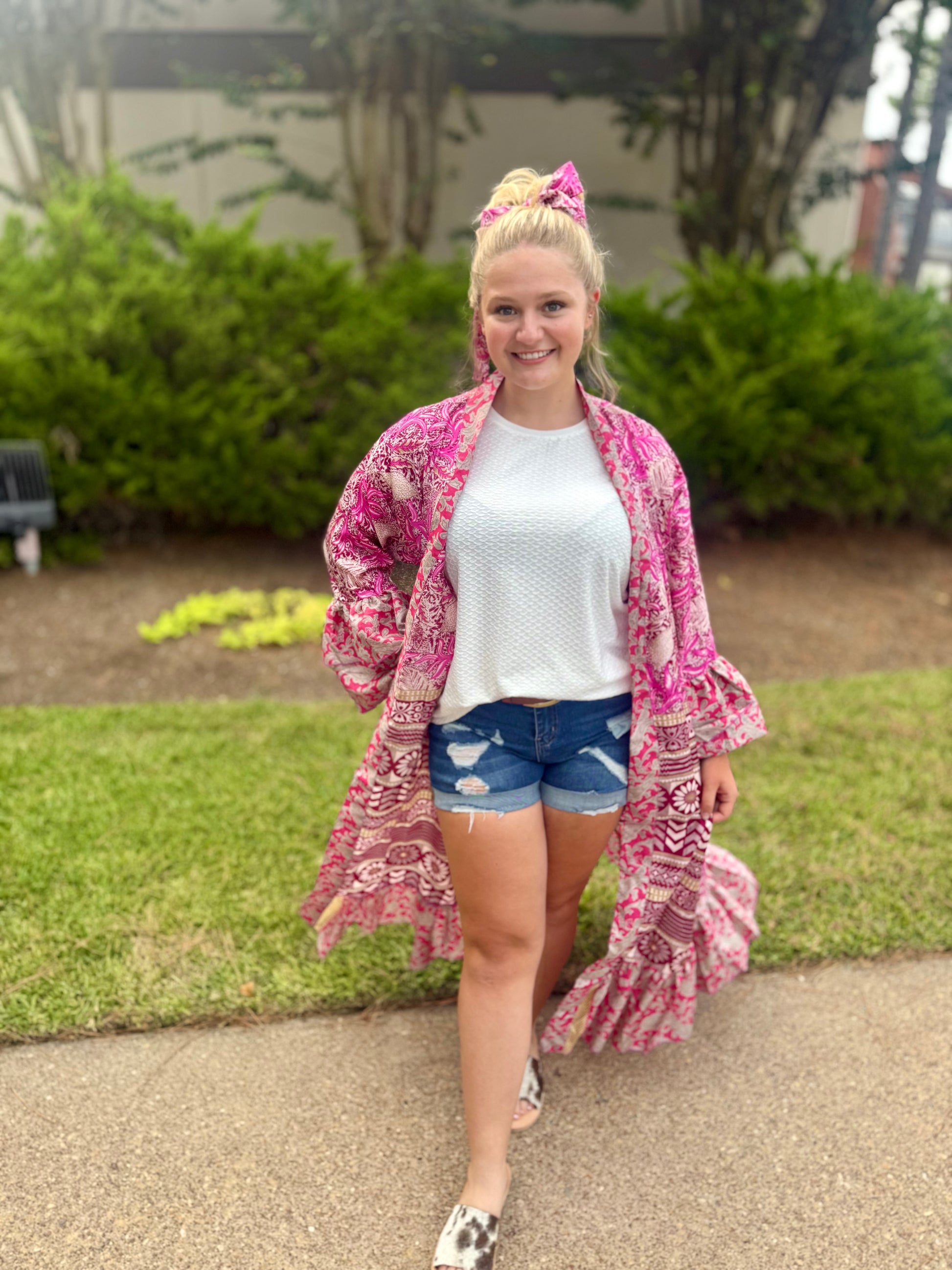 Wrap yourself in elegance and whimsy with the Ruffled Long Silk Kimono Assorted by K & K Table Tops. This flowing silk kimono features playful ruffles that add a touch of fun to its luxurious feel. Perfect for lounging or layering, it brings a splash of vibrant style and comfort to your wardrobe. Embrace effortless charm and silky smooth softness every time you wear it.