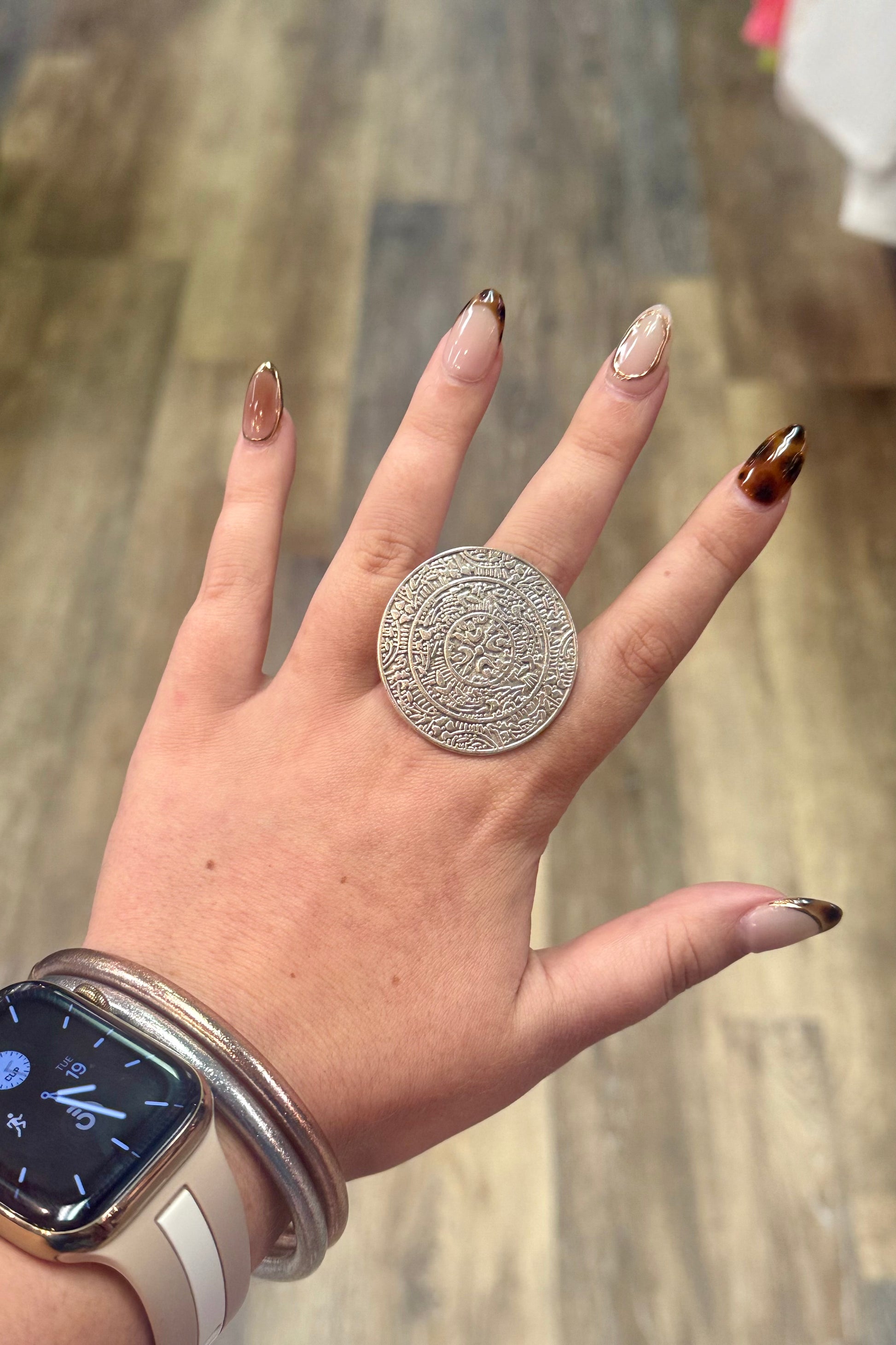 Add a touch of adventure to your look with this brushed silver-tone ring! Inspired by the ancient Aztec circular calendar, its bold disc design shines bright. Wear it on your finger or slide it on to keep your favorite scarf perfectly in place. Plus, it’s expandable for a comfy fit!