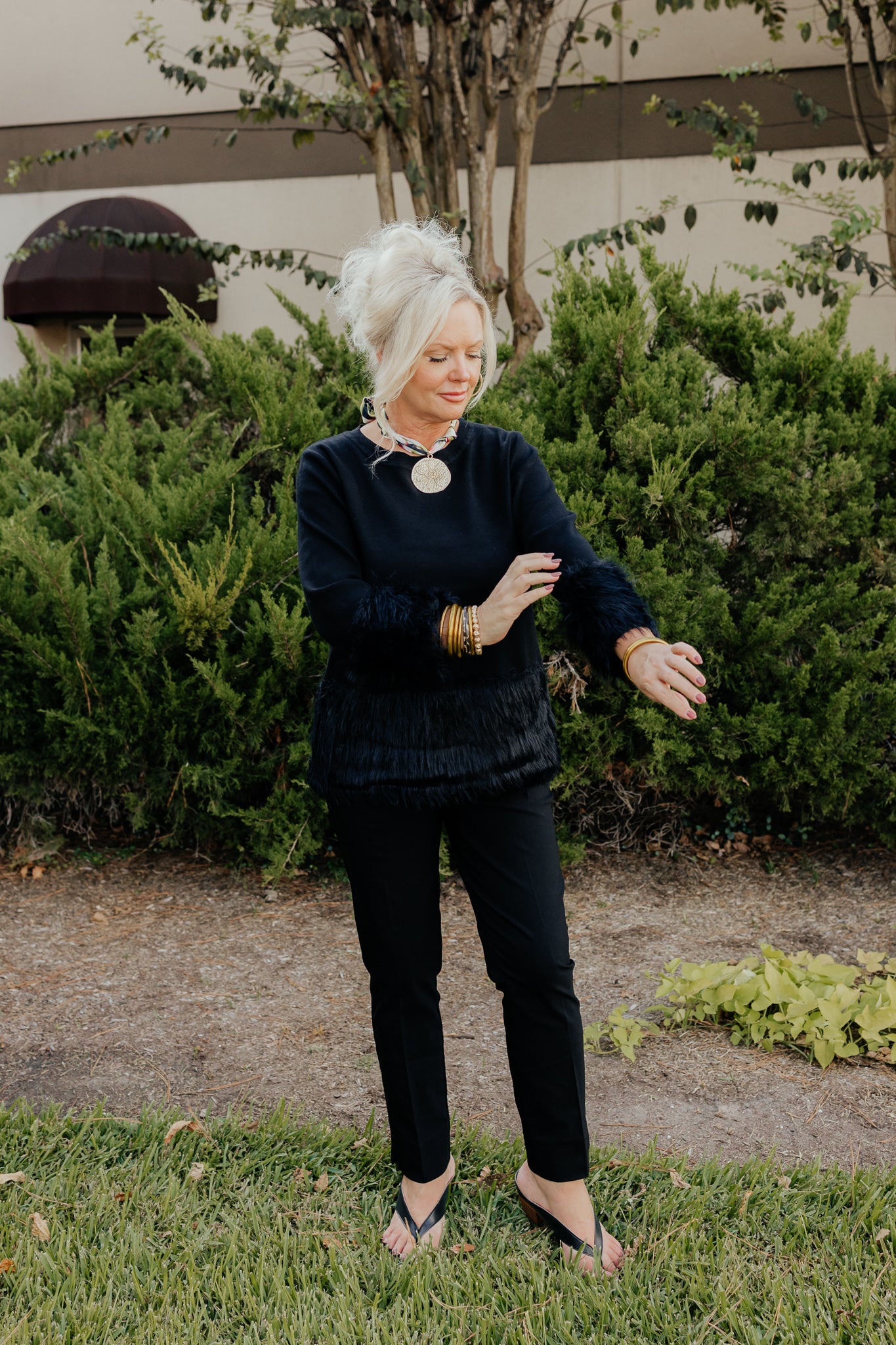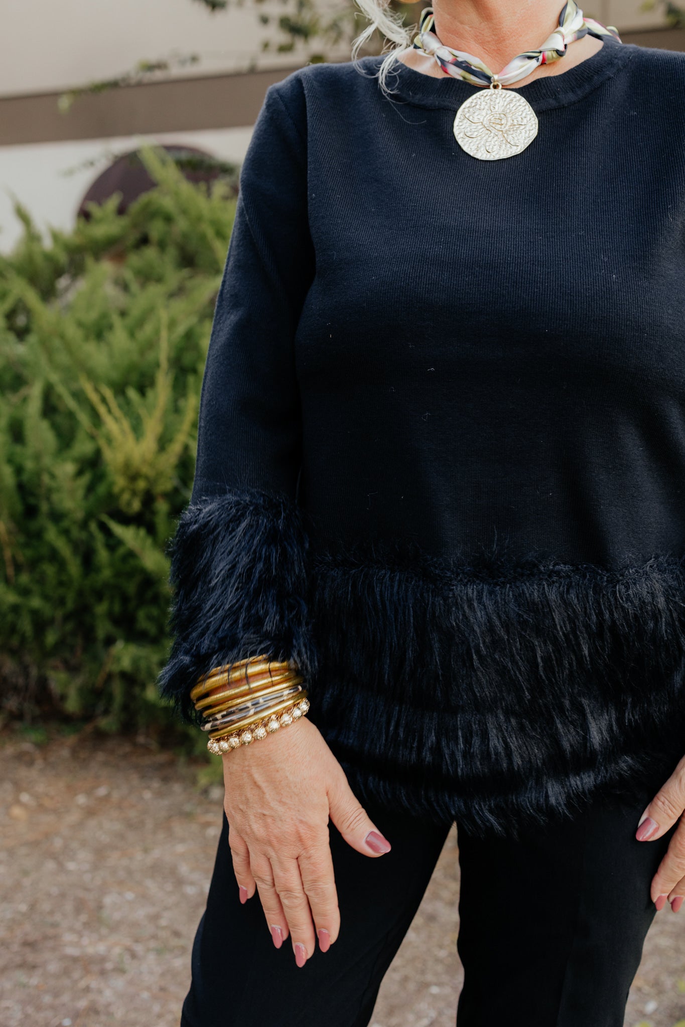 Step out in style with the stunning black Sonia knitted top! This lovely piece boasts long sleeves and a fun fur-trimmed hem and sleeves, making it your perfect pick for cozy sophistication. Simply hand wash and lay flat to dry for easy care, or opt for dry cleaning if you prefer.