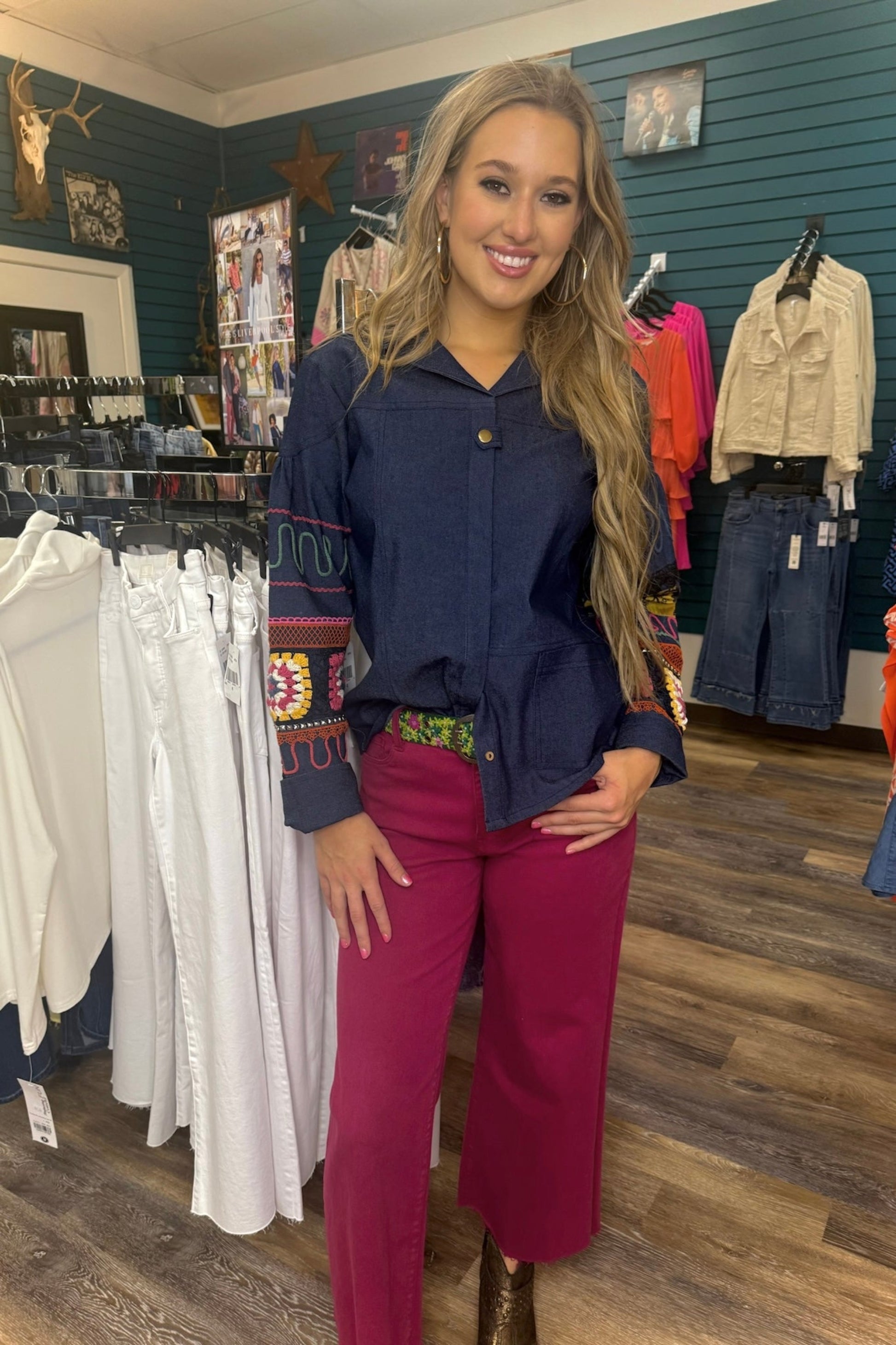 Introducing the Stevie Denim Shirt Jacket - a unique twist on the classic denim jacket. Featuring a cool design on the sleeves, this jacket adds personality and style to any outfit. Get ready to turn heads and make a statement with this one-of-a-kind piece!