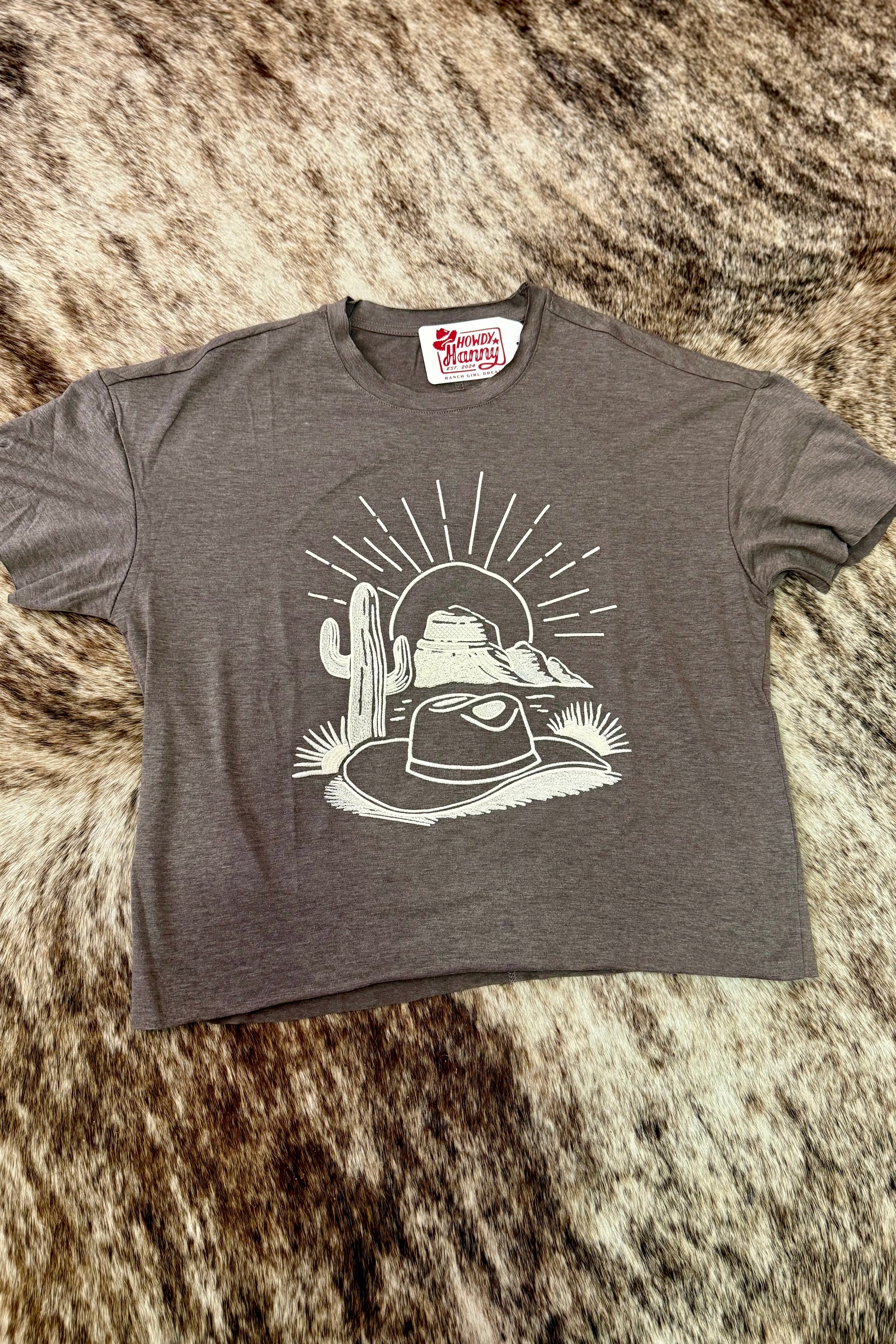 Celebrate your wild west spirit with the Sunrise Hat Tee from Turquoise Haven. This cozy gray tee features a charming cream embroidery of a sunrise crowned by a classic cowboy hat, perfect for ranch girls dreaming of open skies and adventure. Soft, stylish, and playful, it’s your new go-to for casual days filled with sunshine and smiles.