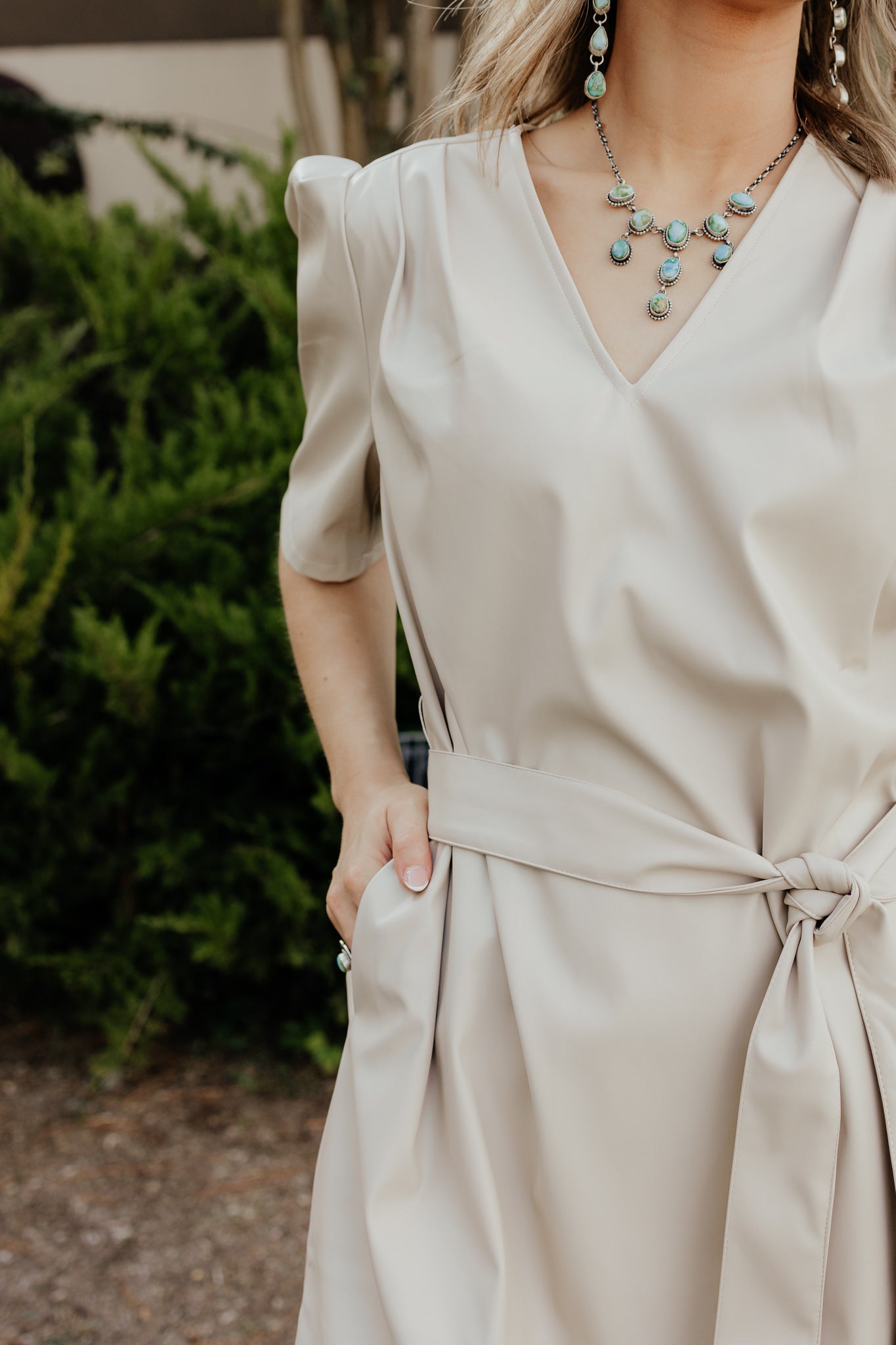 This vegan leather V-neck dress is a chic choice that shines whether you tie it up or let it flow freely. Its lovely fabric and versatile neutral shade make it perfect for adding your favorite accessories and stepping out in style for parties or date nights.
