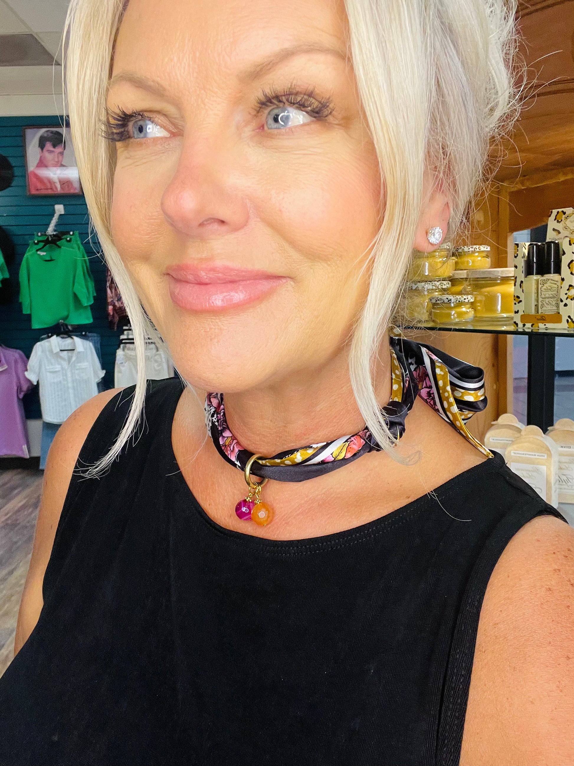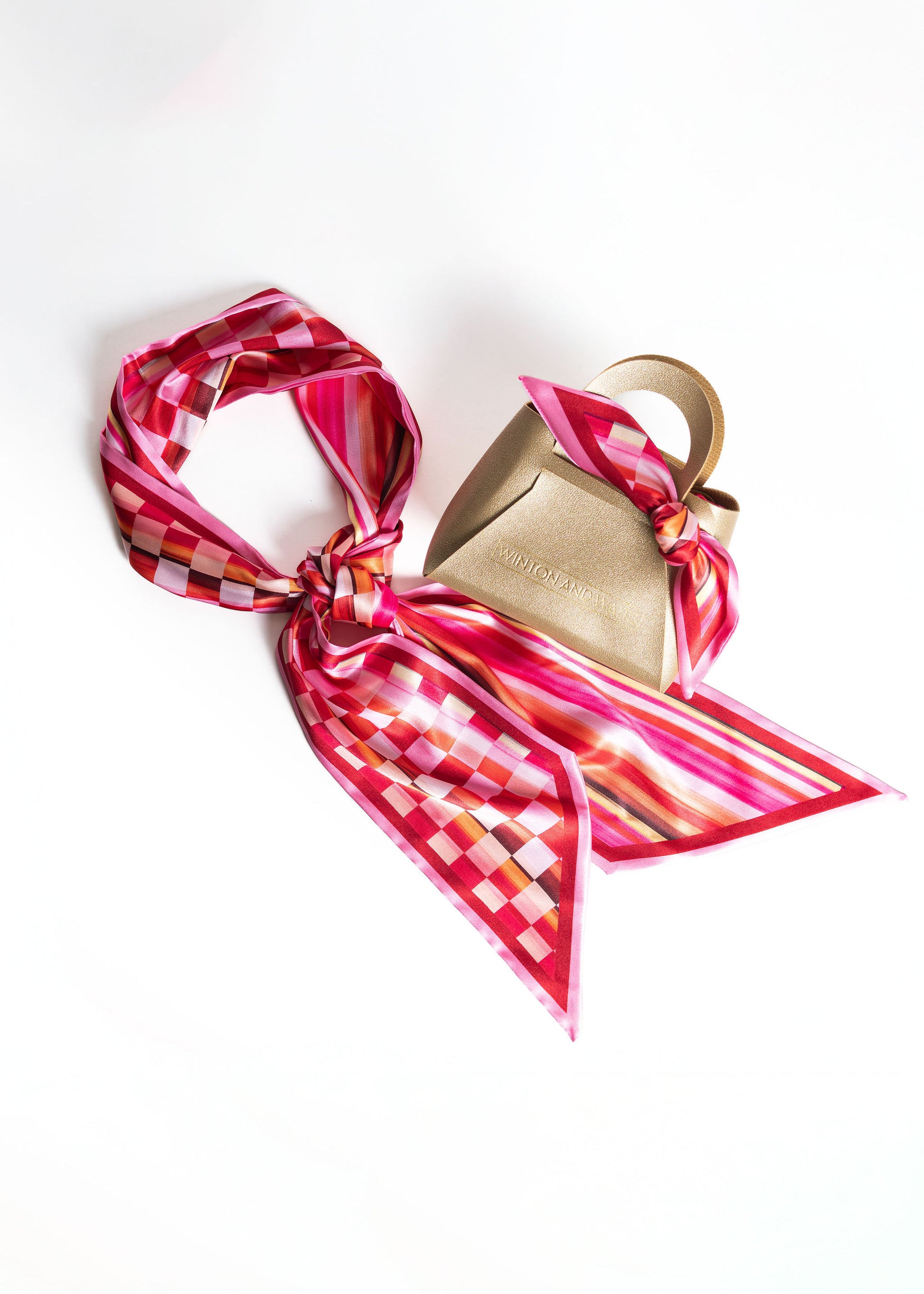 This vibrant print scarf takes inspiration from the iconic Hermes Twilly. Style it as a chic neck scarf or a fun hair tie. It’s also perfect for sprucing up handbags, belts, hats, and more. Comes tucked inside a cute mini Winton and Waits gift bag. Made from silky modal satin, measuring 54" by 4.5". Care with gentle wash or handwash, hang to dry, and cool iron if necessary.