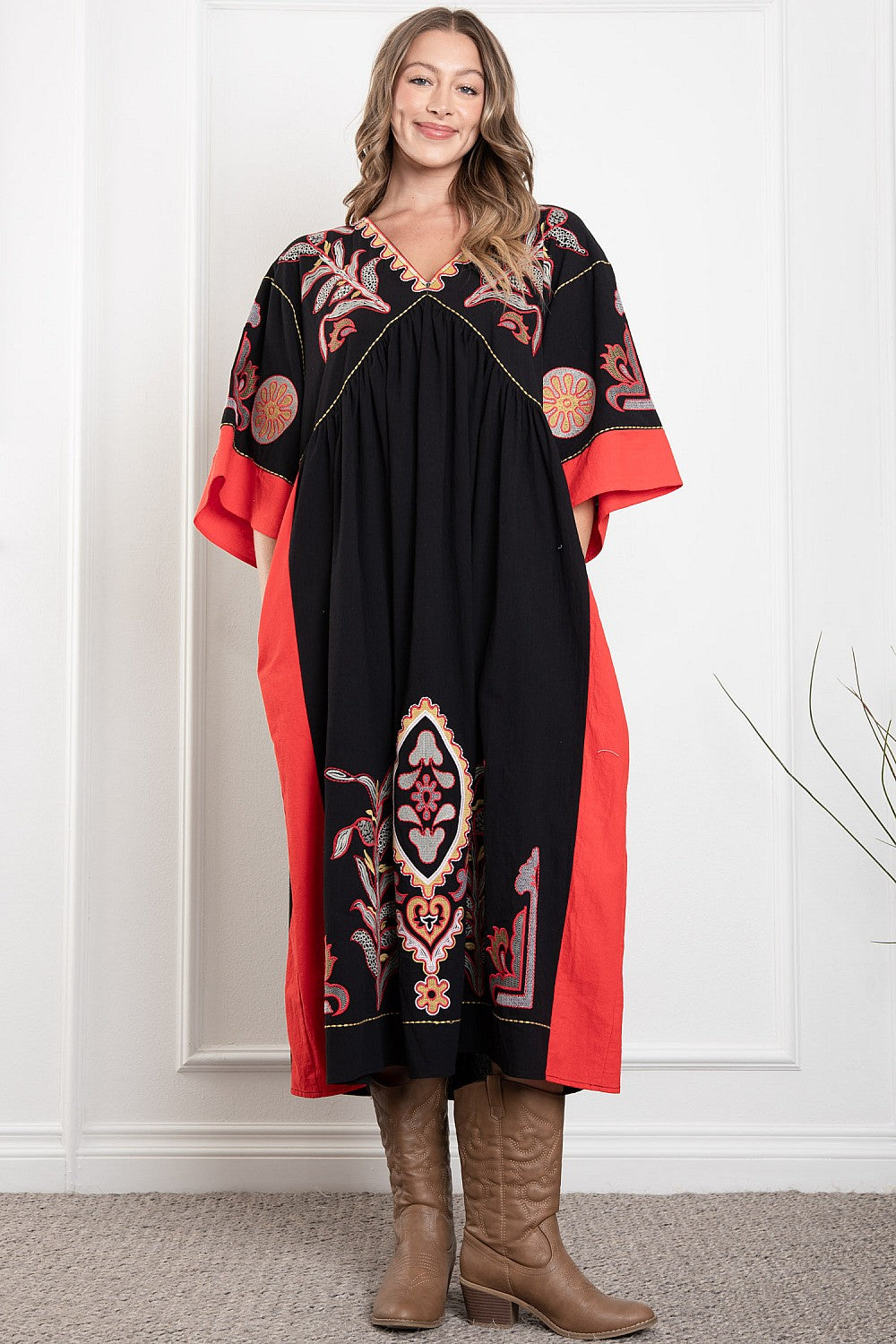 Get ready to turn heads in the Deep V-Neck Mid Sleeve Maxi Dress! With its deep v-neck, mid-length sleeves, pockets, and unique embroidered designs, this dress is perfect for spring. Made by Blue Velvet in Los Angeles, California, you'll feel confident and stylish in this dress.