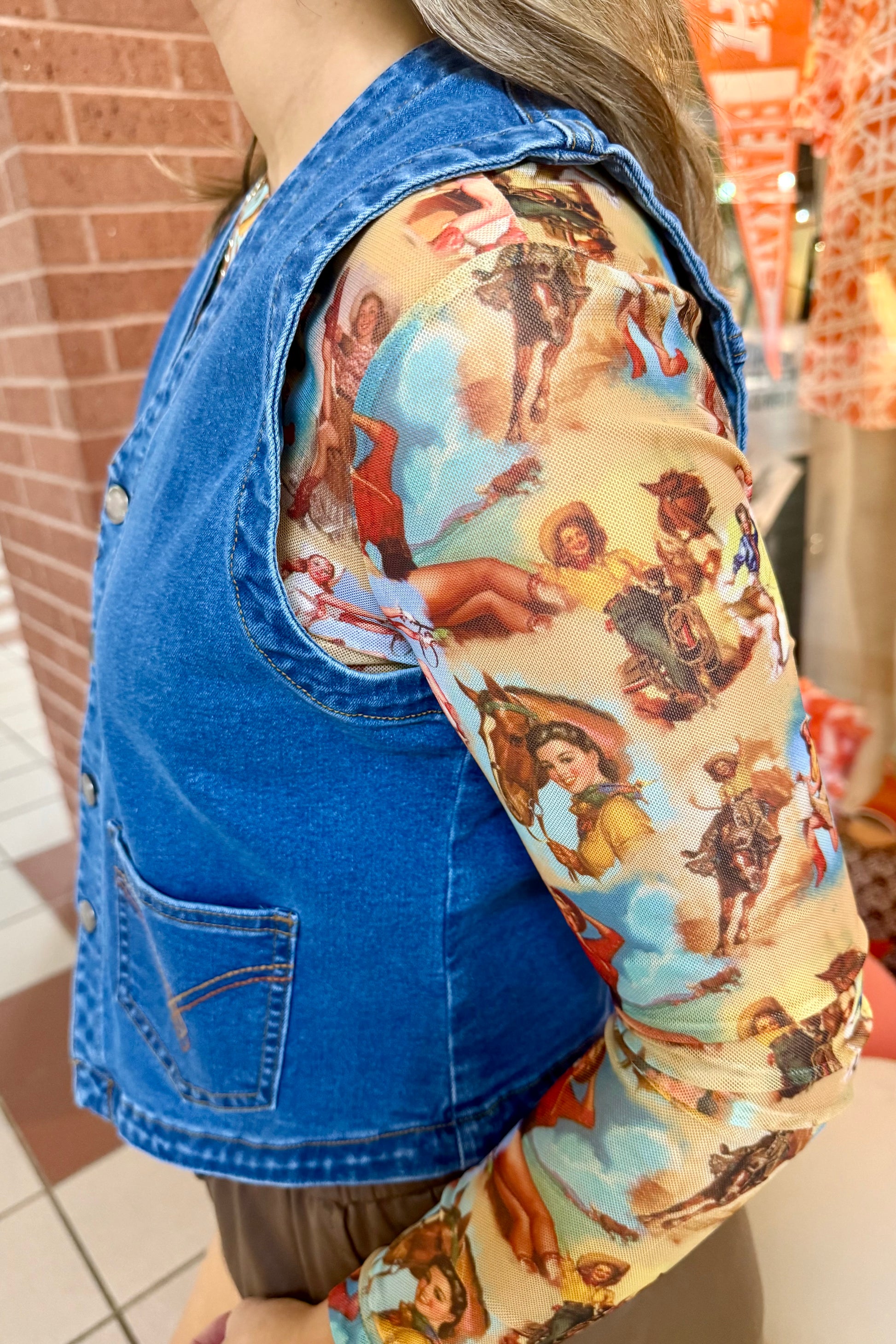 Vintage Cowgirl Print Fitted Mesh Top by Turquoise Haven