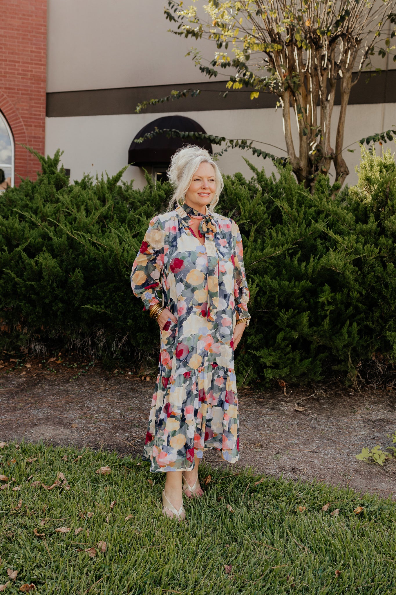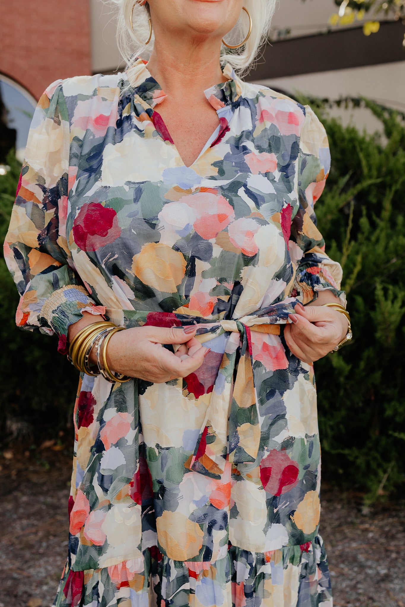 This maxi dr features a print that looks like a dreamy impressionist painting—and it even comes with pockets! The split neckline is topped with a delicate ruffle, while the body is lined for comfort and the sheer sleeves gather sweetly at the wrists. A detachable self belt lets you switch up your style, and the dress finishes with a long flounce ruffle hem. Made from a comfy poly blend, it’s easy to care for with a cool gentle wash and hang dry.