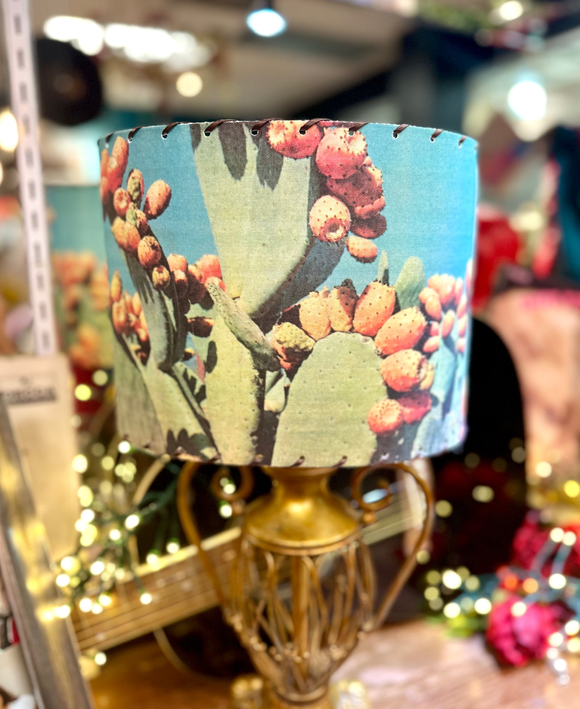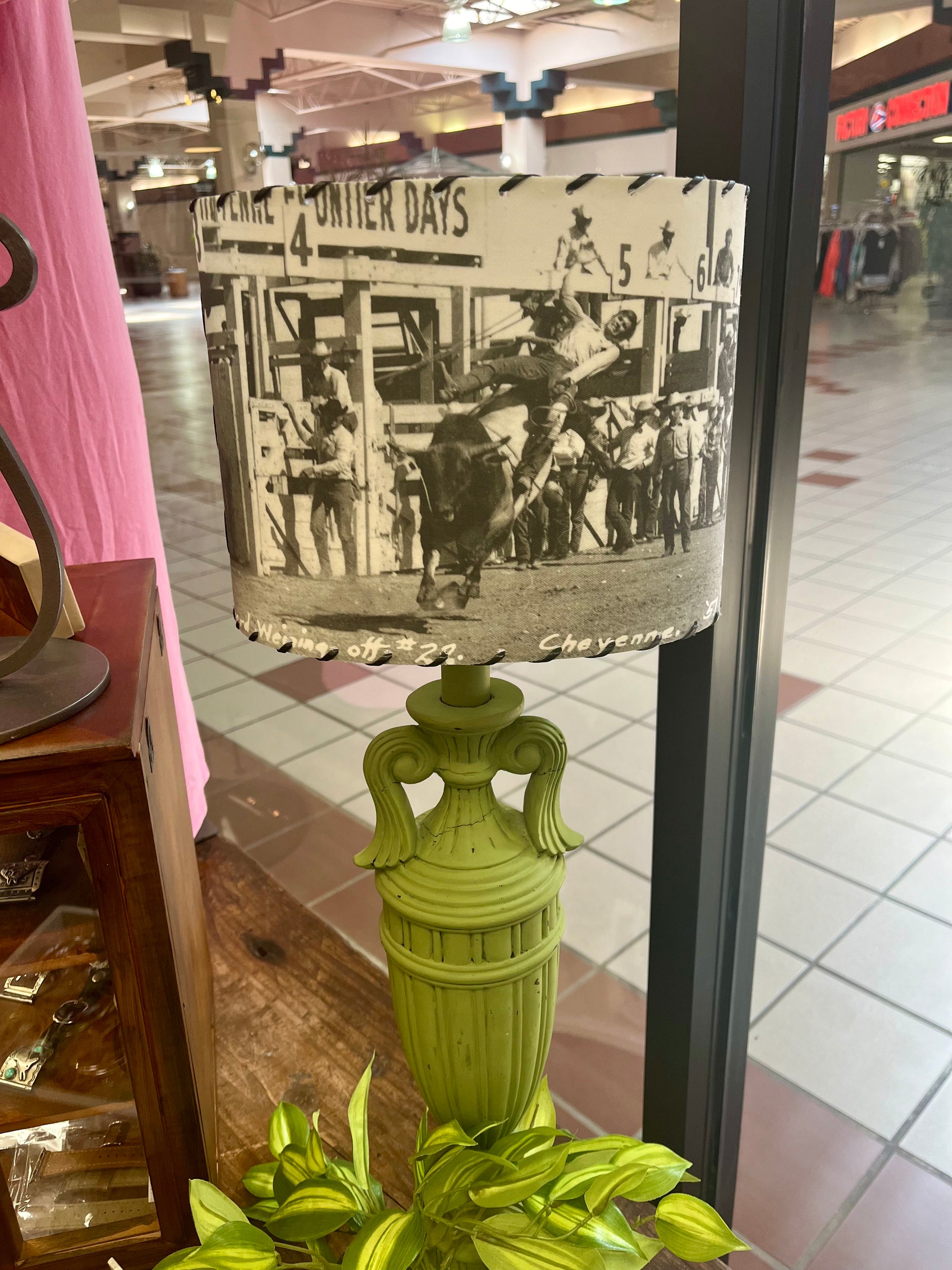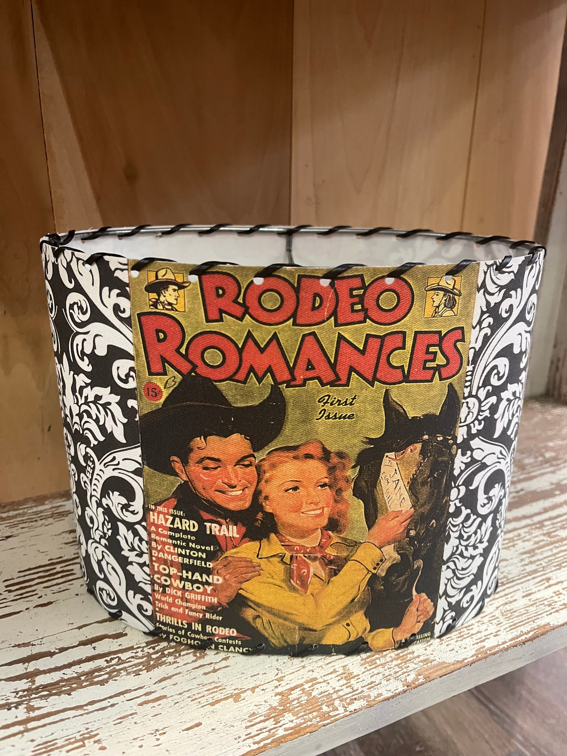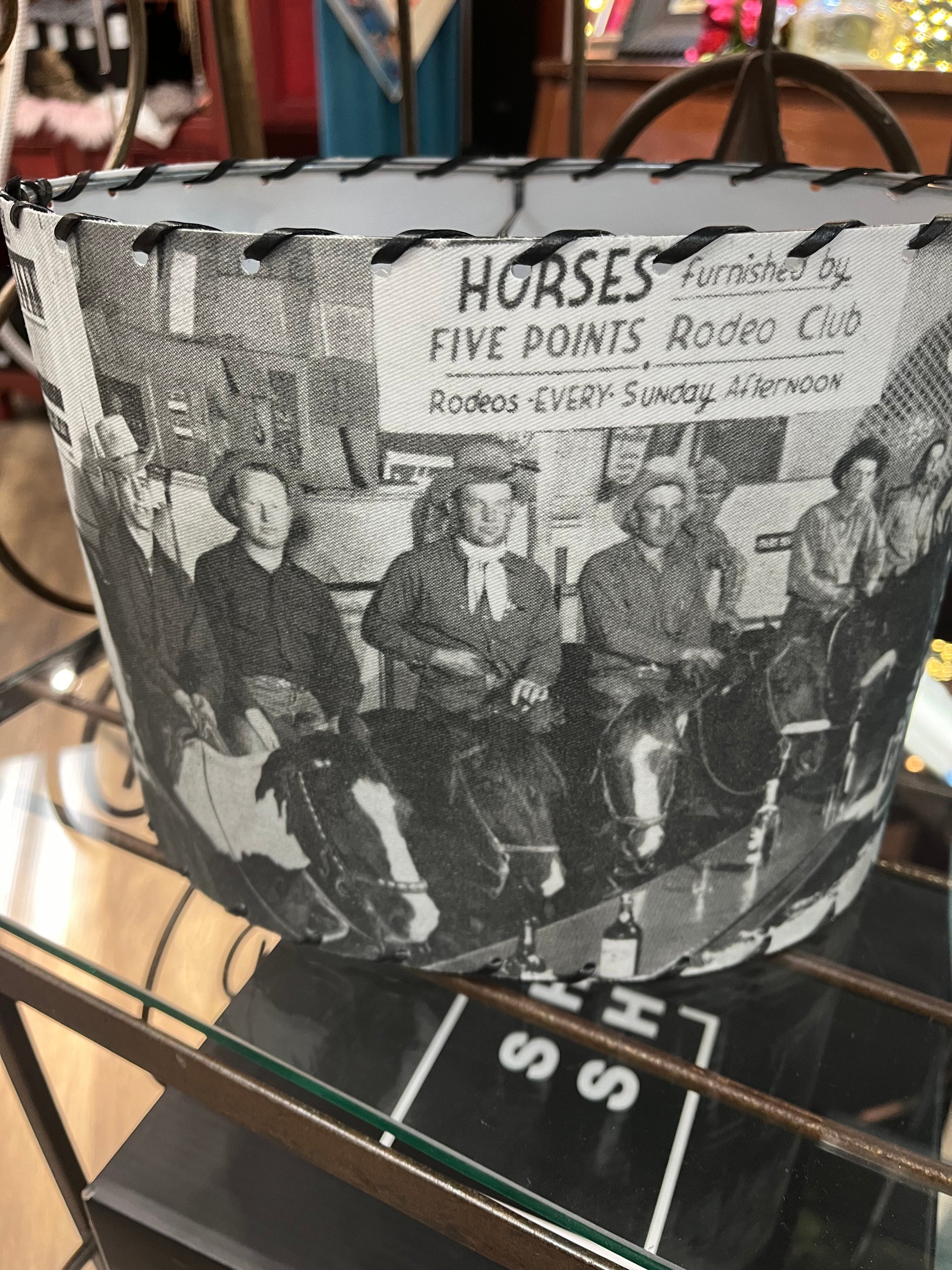 Liven up your place with one of our Western Lamp Shades! Our handmade designs feature nostalgic images and travel mementos, accented with a leather strap. Size: 9 3/4 x 7/12