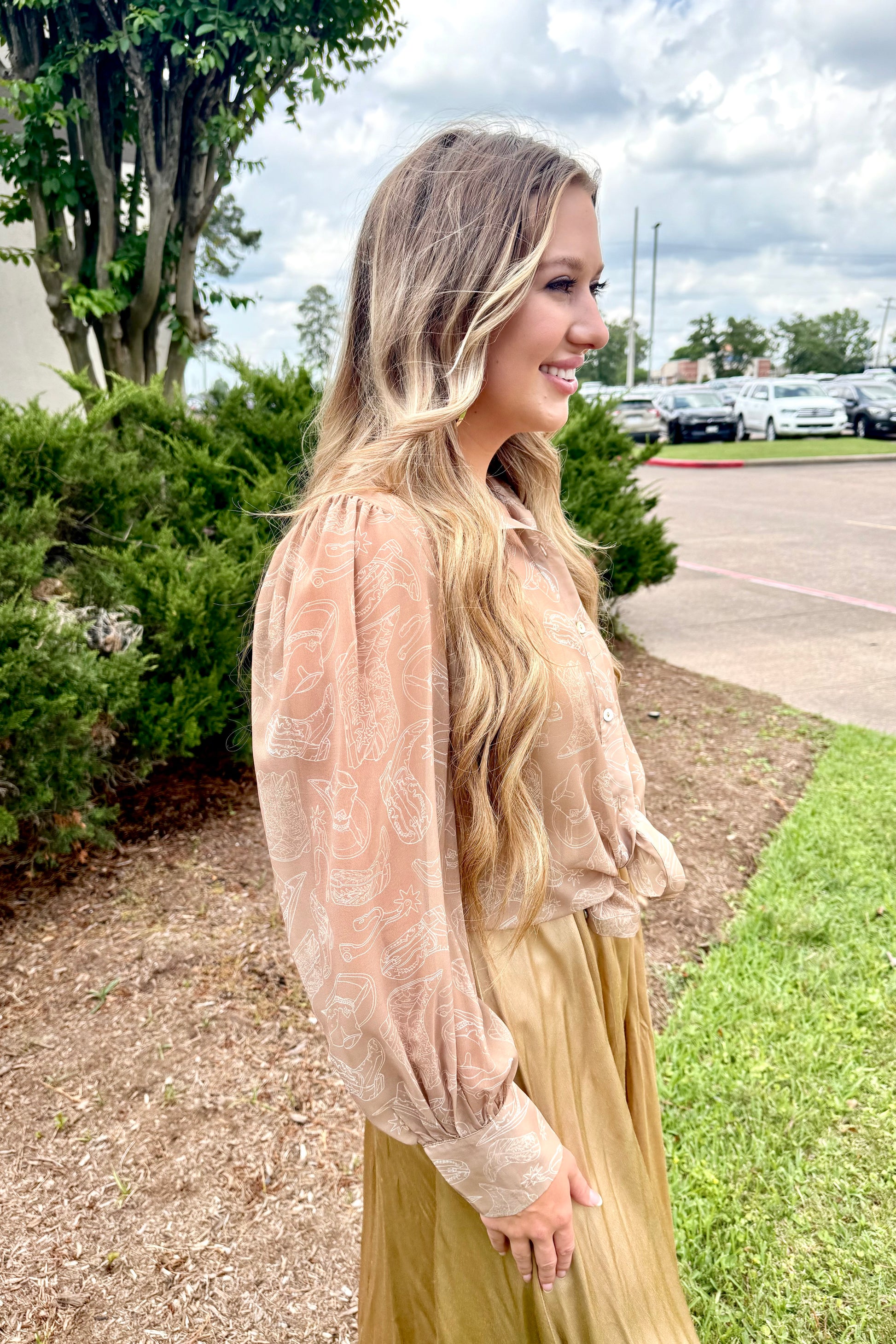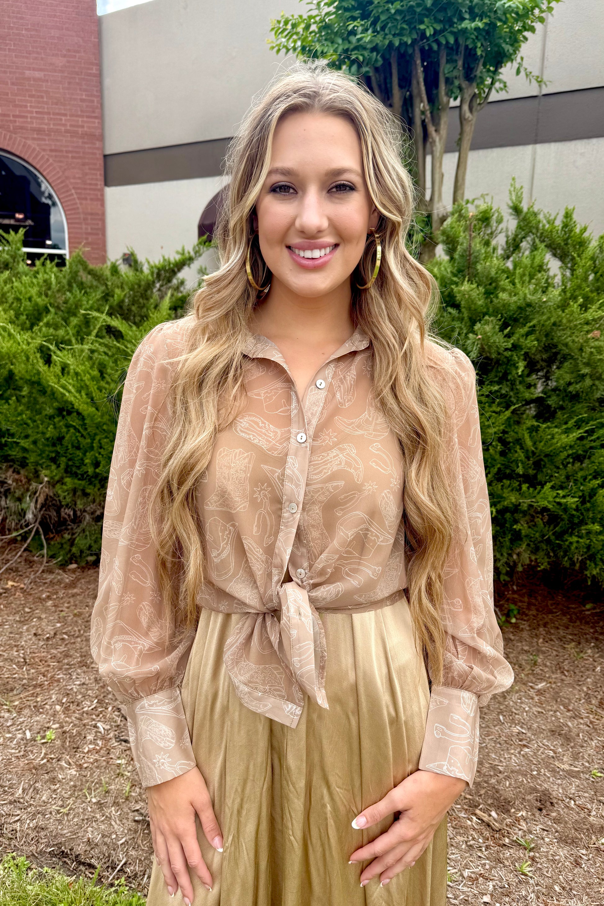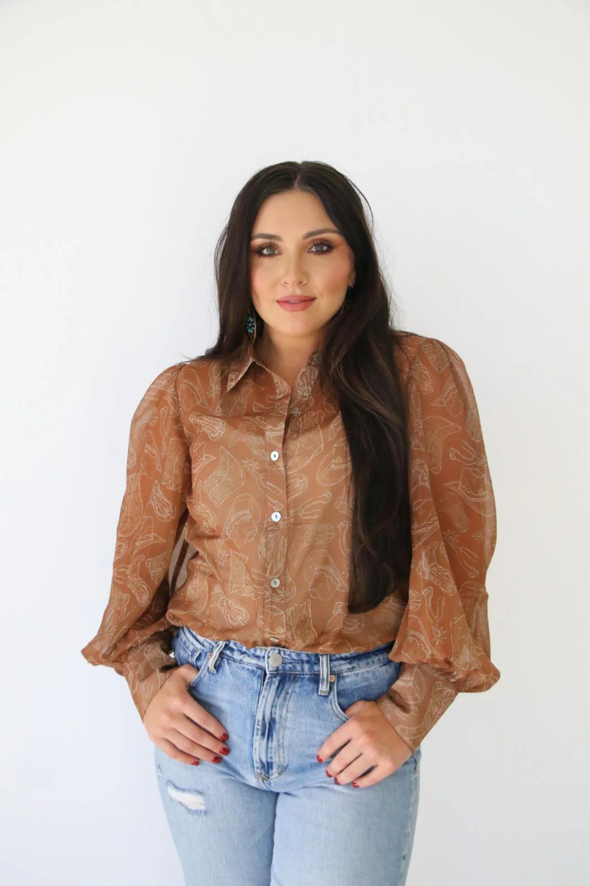 Indulge in the luxurious allure of our Western Things Blouse by Turquoise Haven, crafted with a beautiful, sheer brown fabric adorned with intricate western motifs. This button up blouse features subtle puff sleeves, elevating your wardrobe with elegance and sophistication.